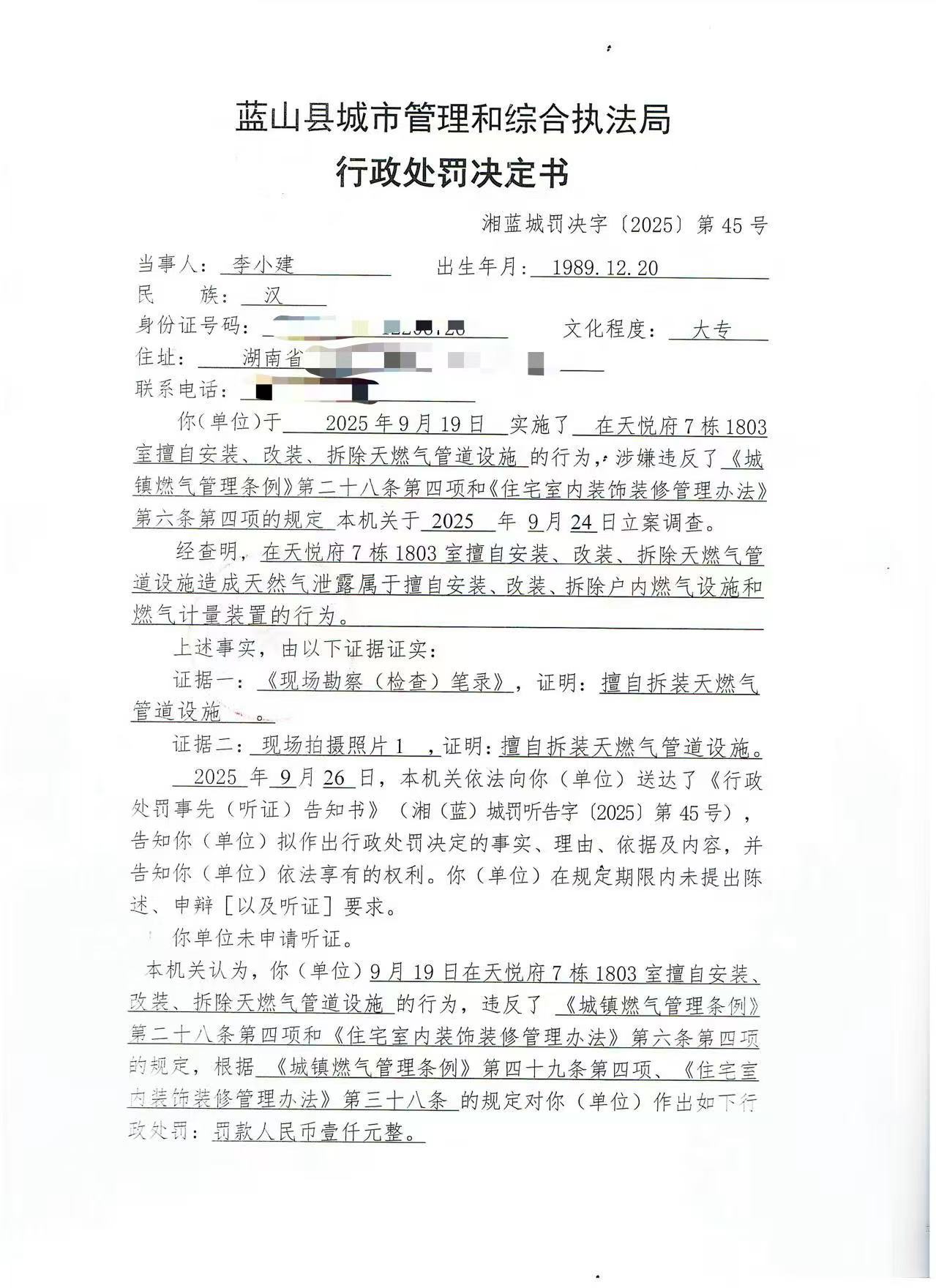 名称: 李小建在天悦府7栋1803室擅自安装、改装、拆除天然气管道设施行为