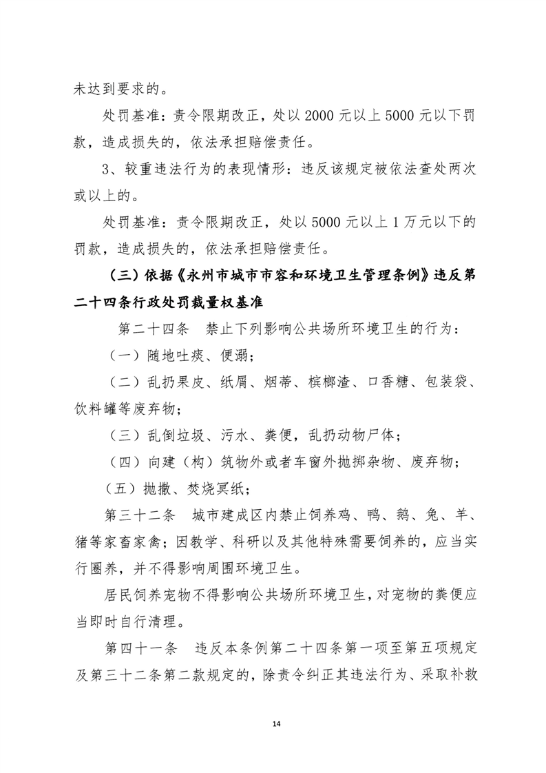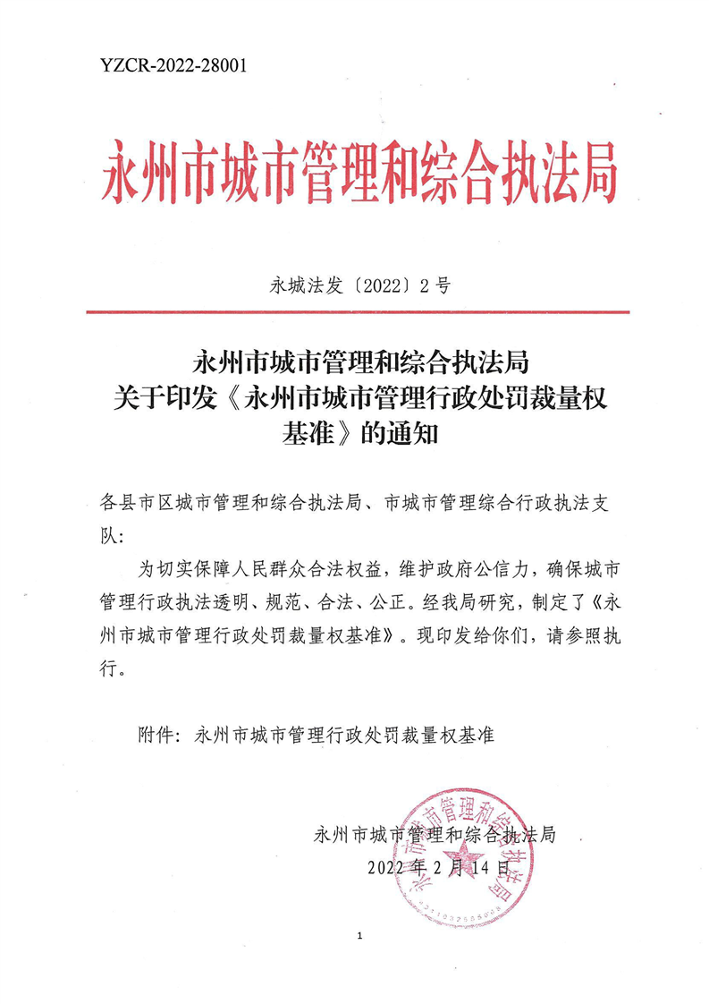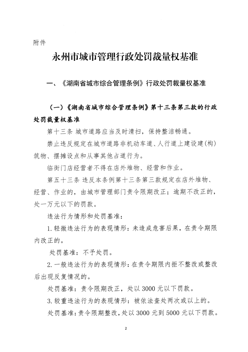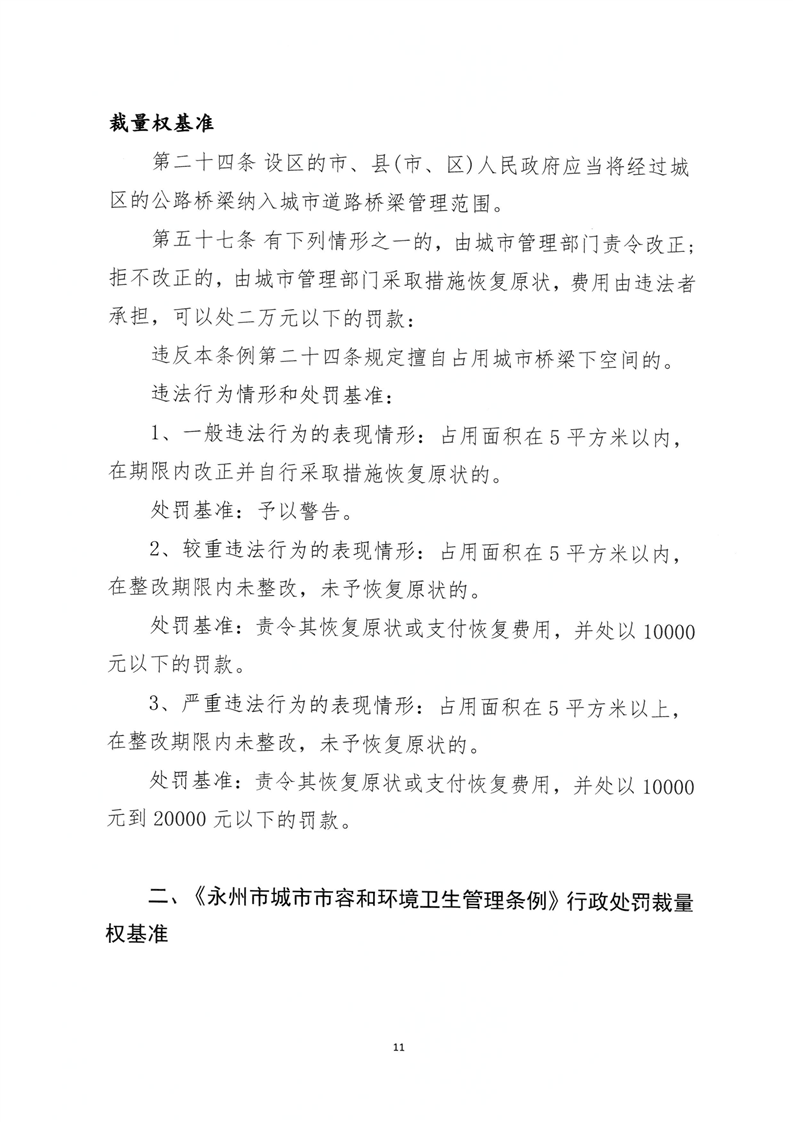 关于印发《永州市城市管理行政处罚裁量权基准》的通知