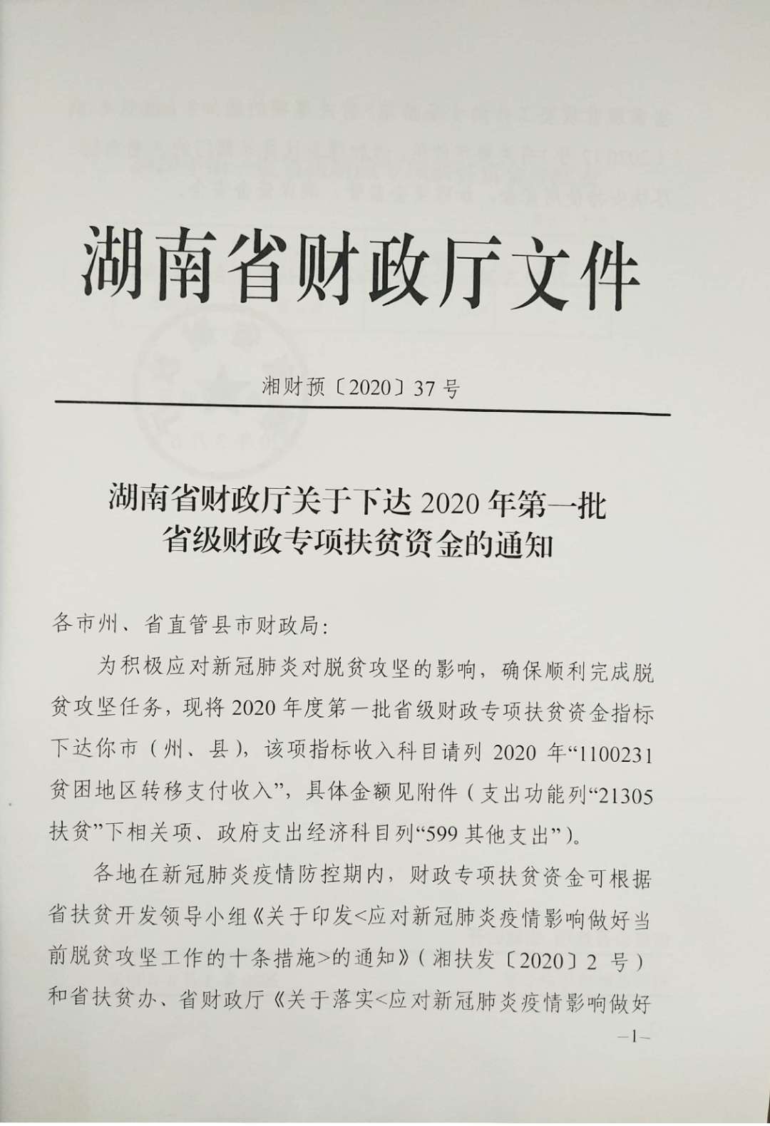 名称: 湖南省财政厅关于下达2020年第一批省级财政专项扶贫资金的通知