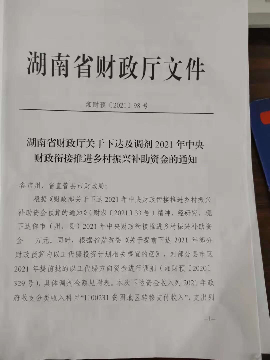 名称: 湖南省财政厅关于下达及调剂2021年中央财政衔接推进乡村振兴补助资金的通知
