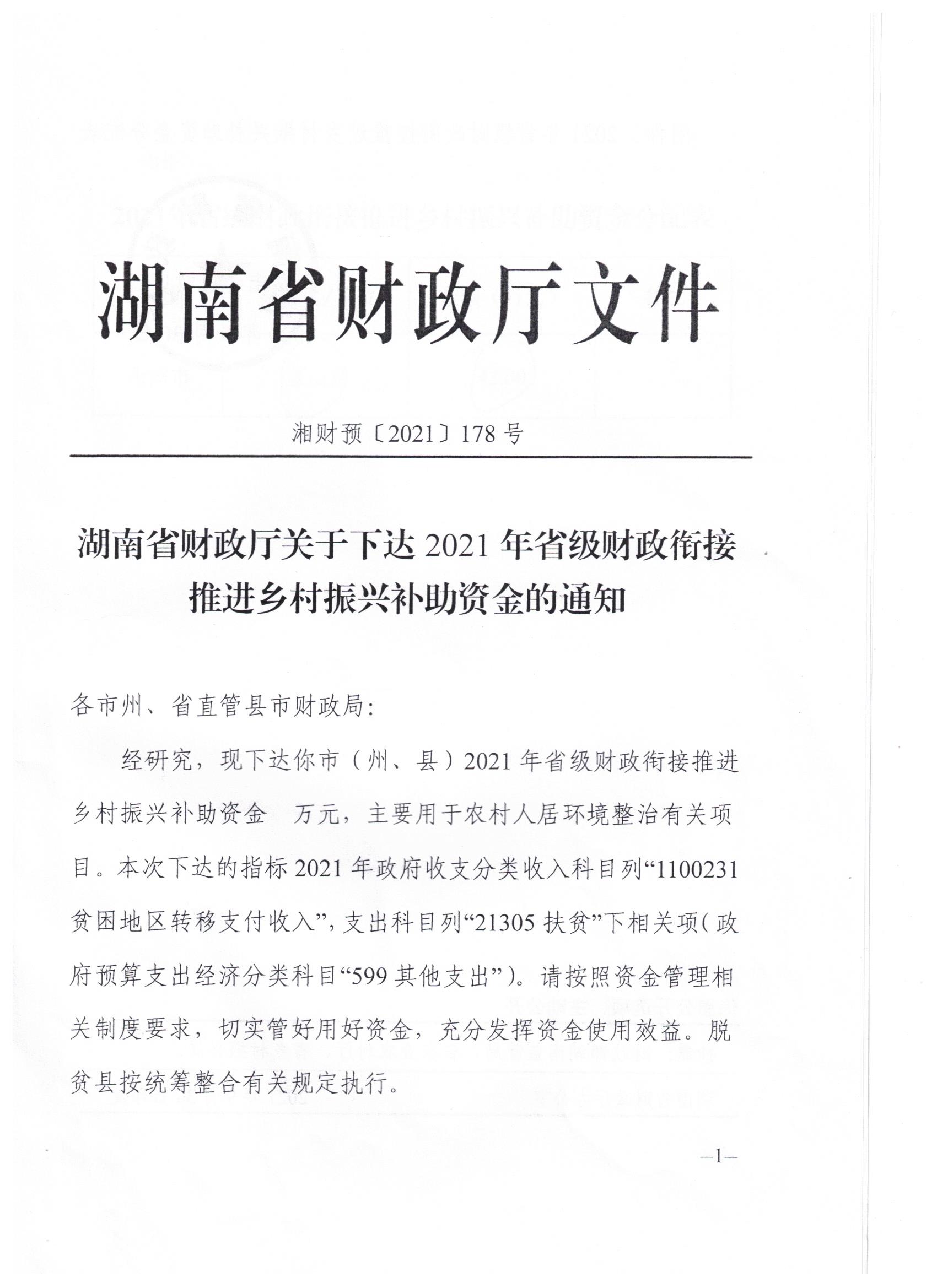 名称: 湖南省财政厅关于下达2021年省级财政衔接推进乡村振兴补助资金的通知