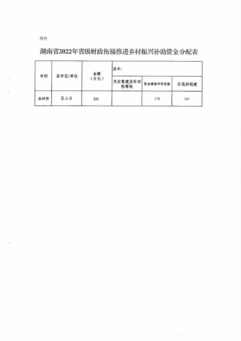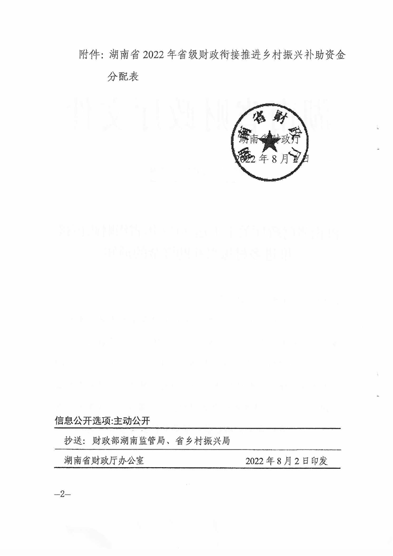 湖南省财政厅关于下达2022年省级财政衔接推进乡村振兴补助资金的通知