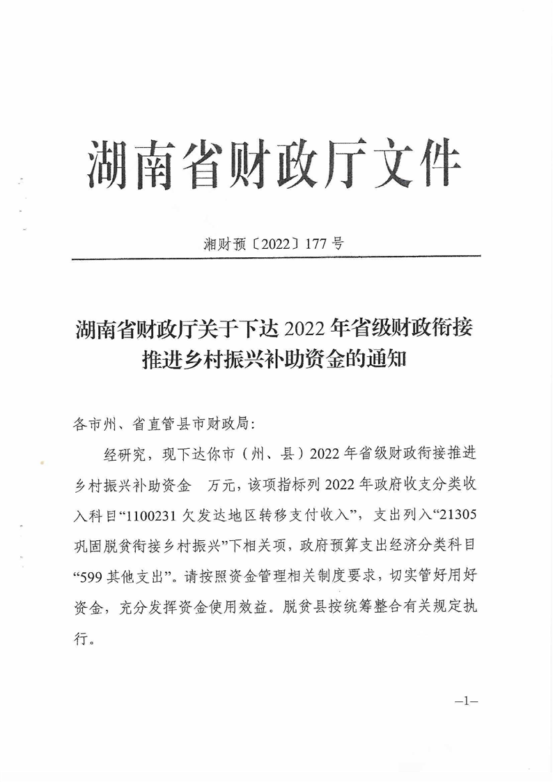 名称: 湖南省财政厅关于下达2022年省级财政衔接推进乡村振兴补助资金的通知