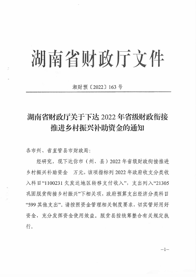 名称: 湖南省财政厅关于下达2022年省级财政衔接推进乡村振兴补助资金的通知