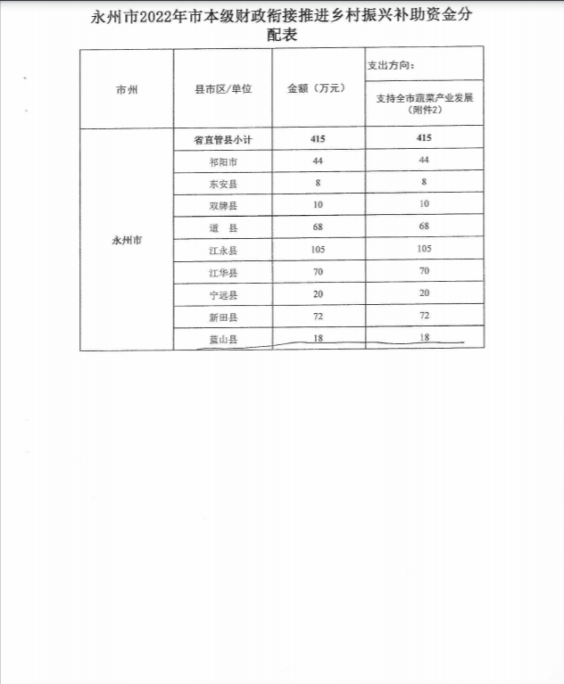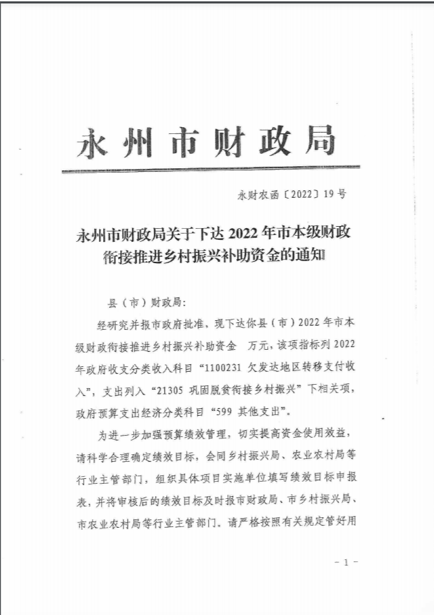 名称: 永州市财政局关于下达2022年市本级财政衔接推进乡村振兴补助资金的通知