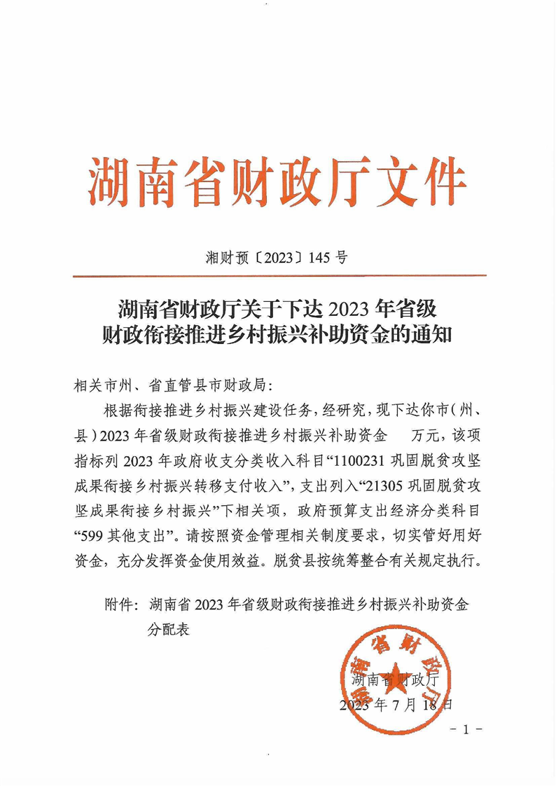 名称: 湖南省财政厅关于下达2023年省级财政衔接推进乡村振兴补助资金的通知