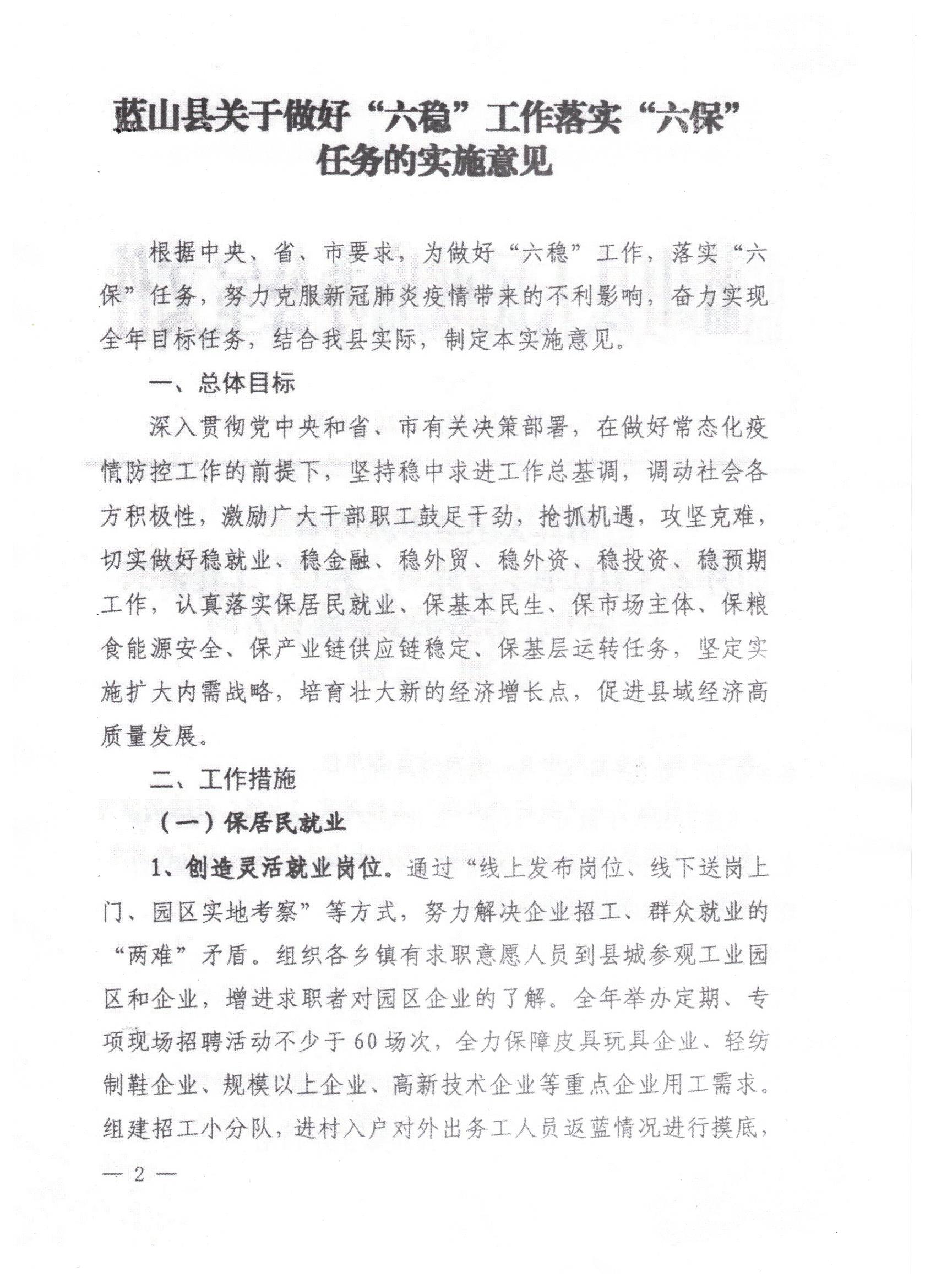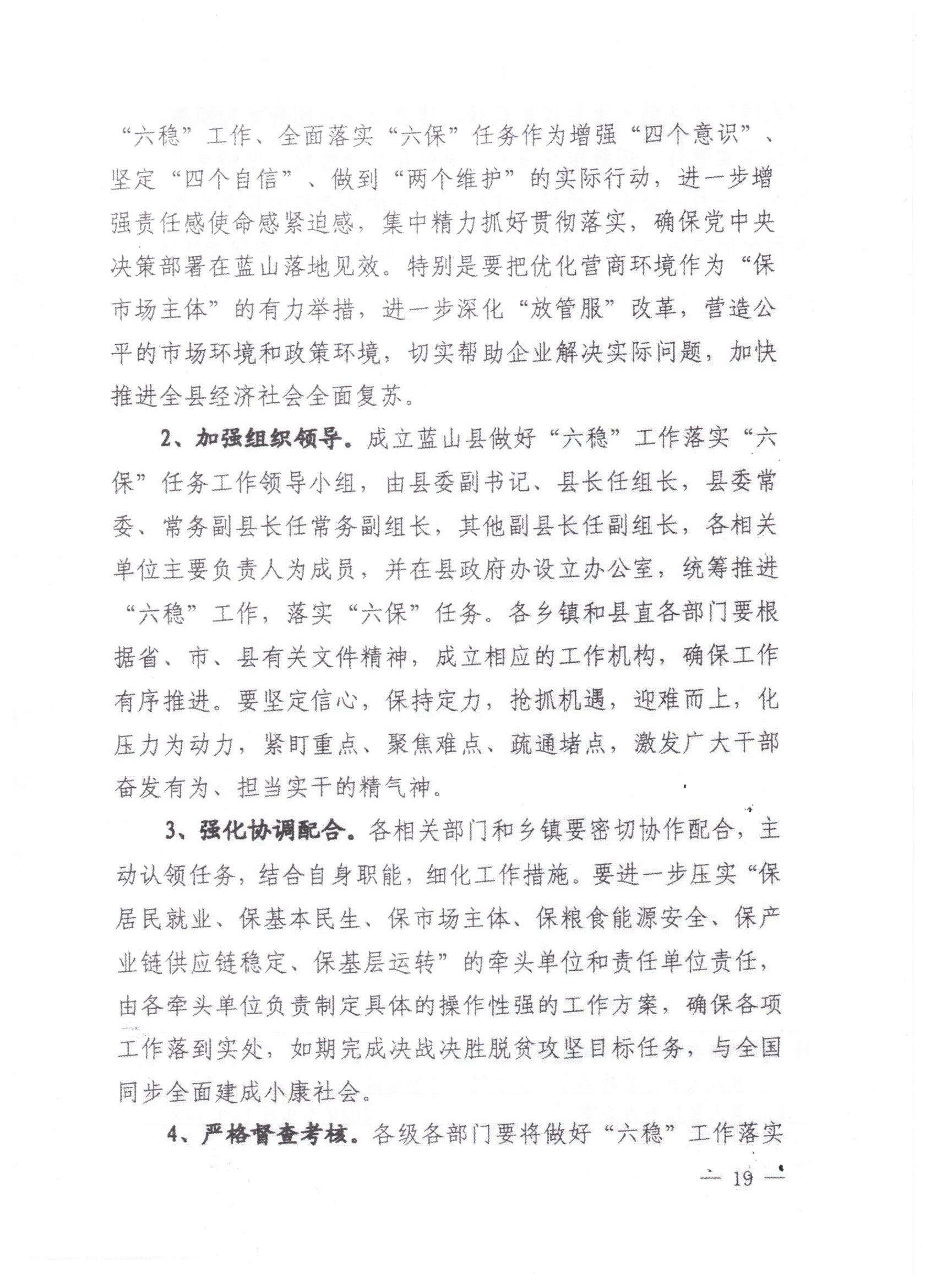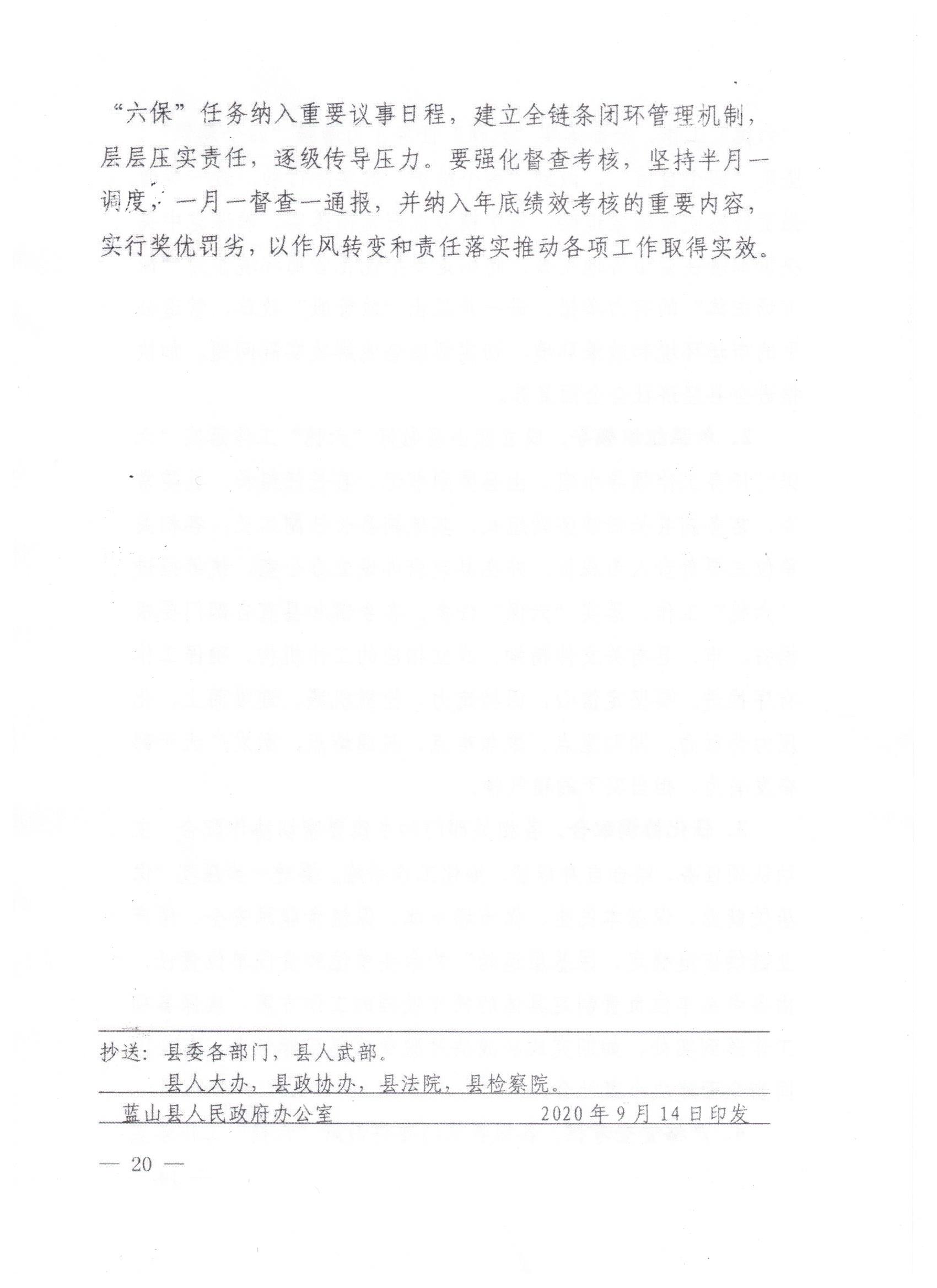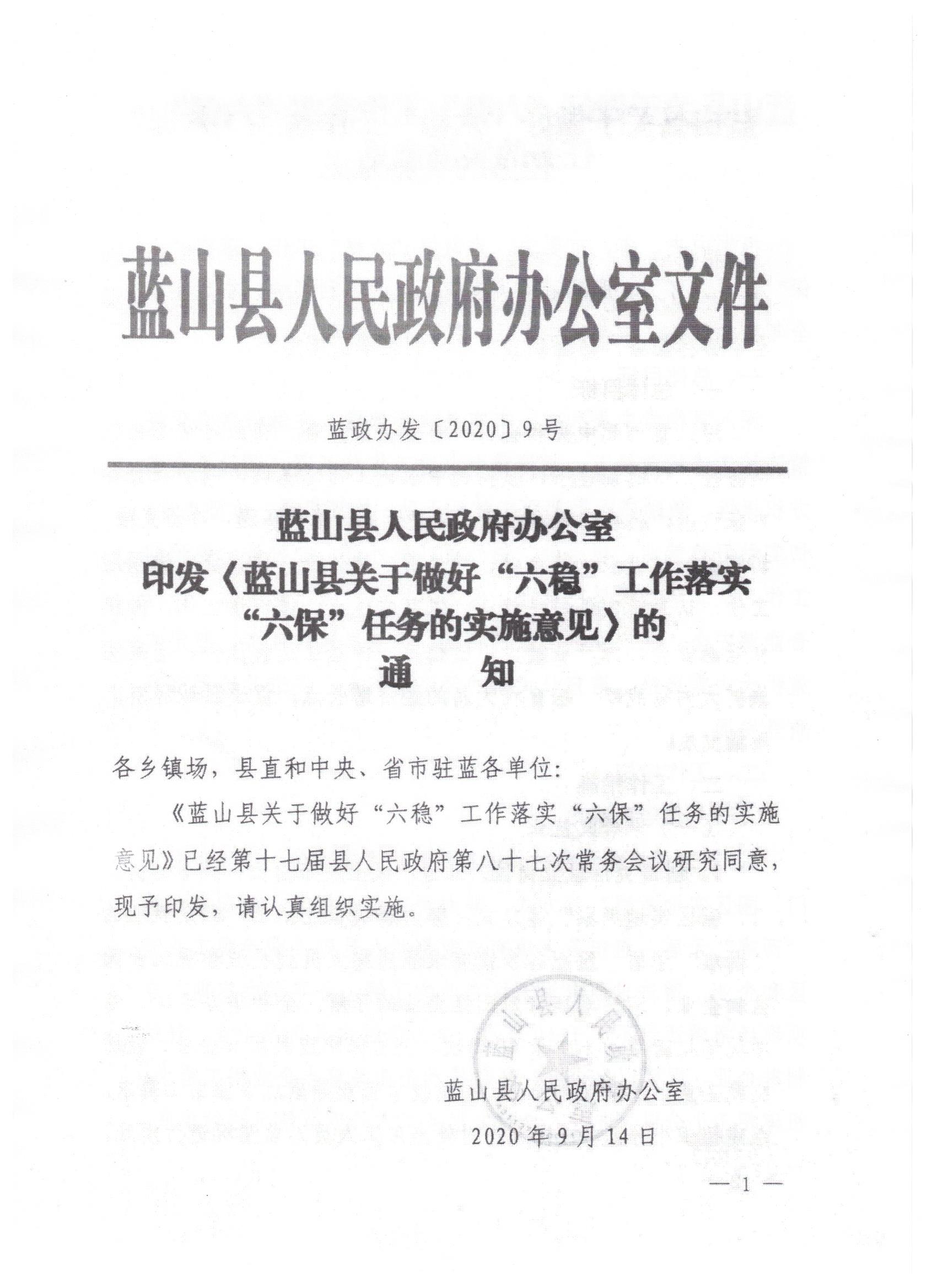 名称: 蓝山县人民政府办公室印发《蓝山县关于做好“六稳”工作落实“六保”任务的实施意见》的通知