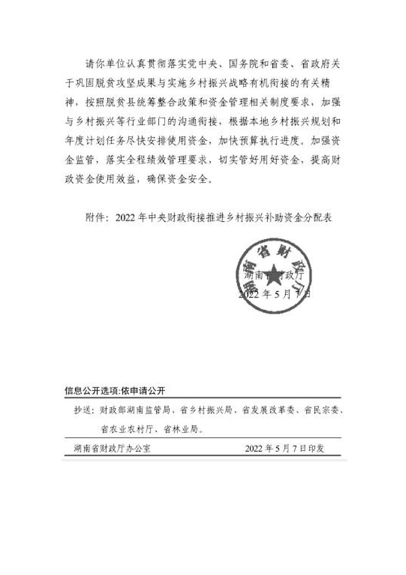 湖南省财政厅关于下达2022年中央财政衔接推进乡村振兴补助资金的通知