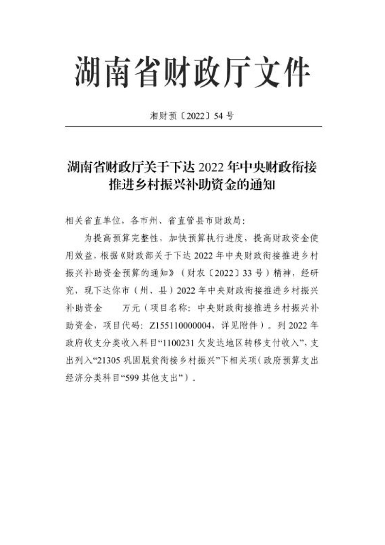 名称: 湖南省财政厅关于下达2022年中央财政衔接推进乡村振兴补助资金的通知