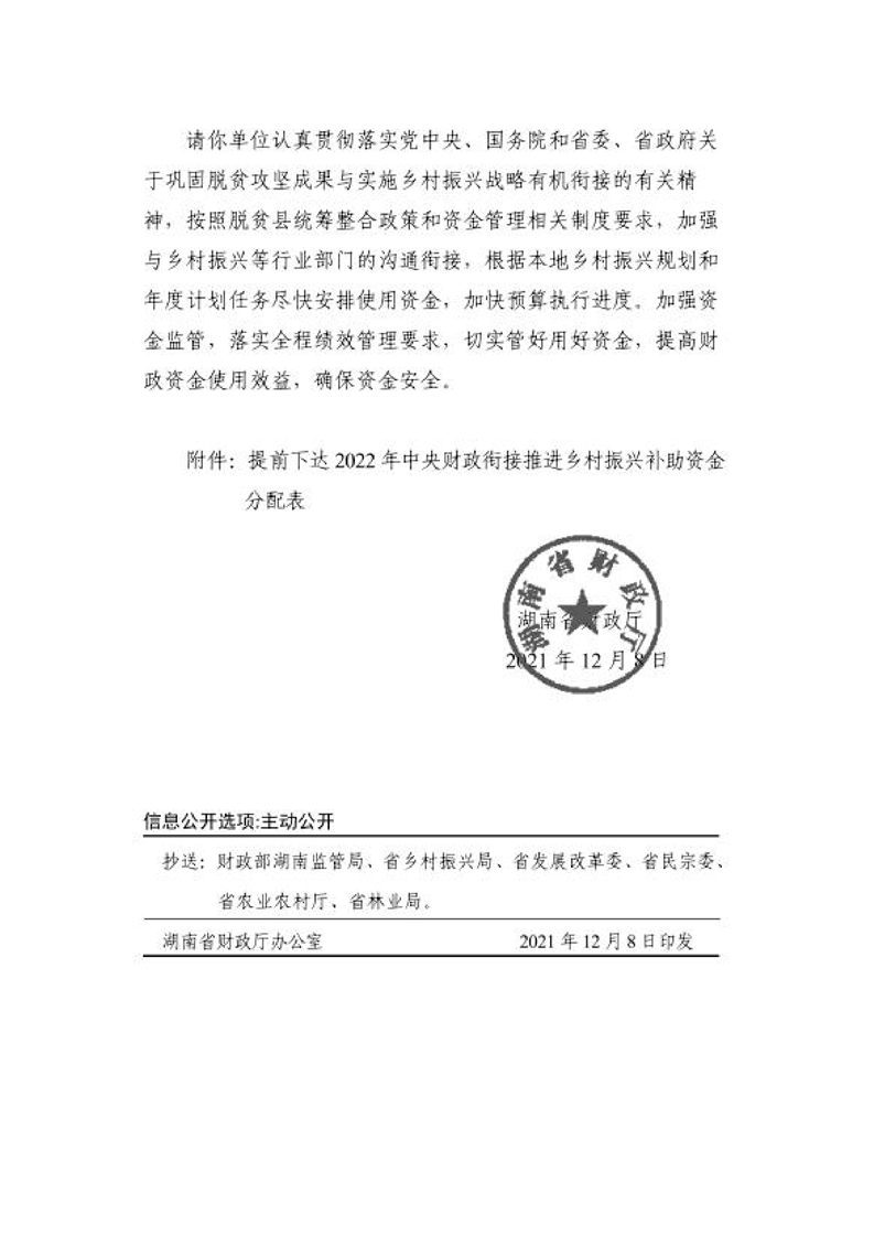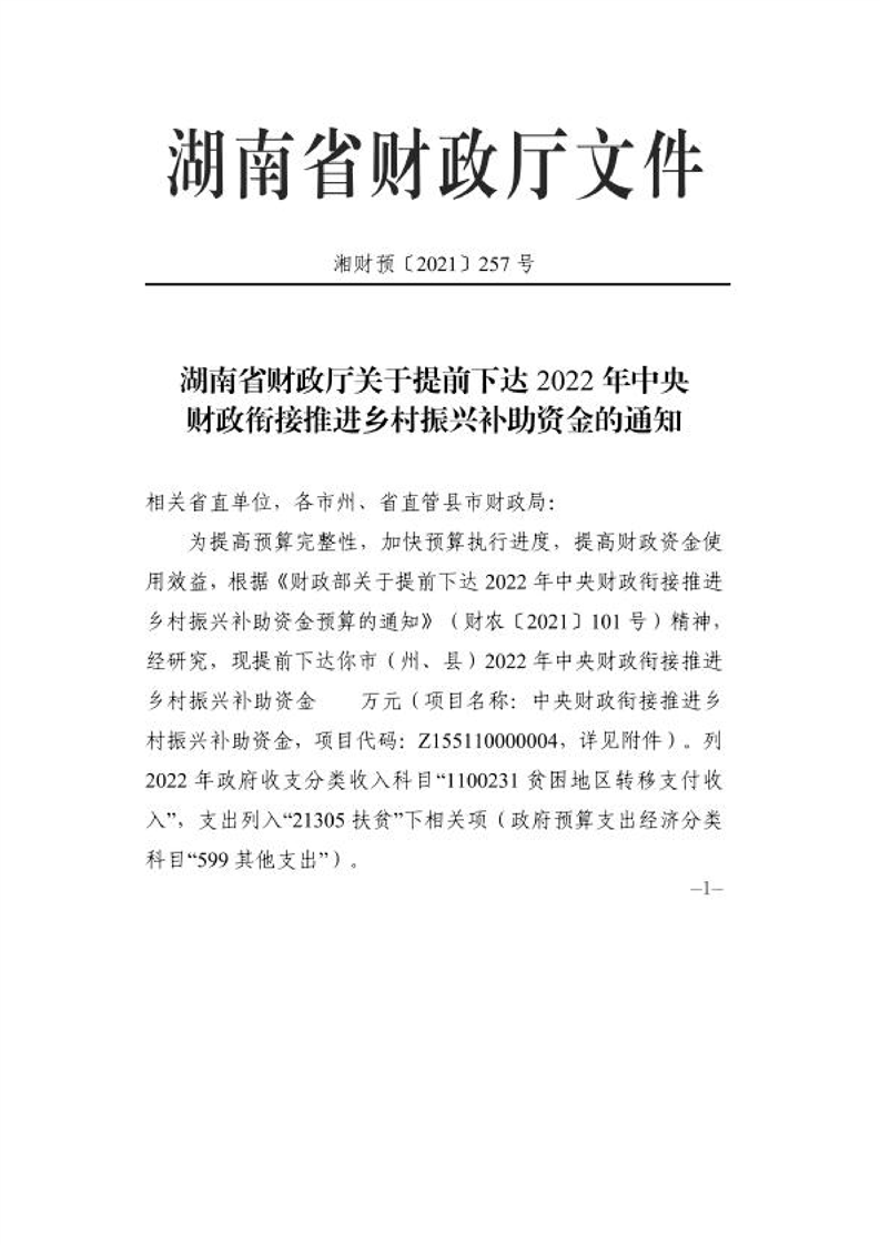 湖南省财政厅关于提前下达2022年中央财政衔接推进乡村振兴补助资金的通知