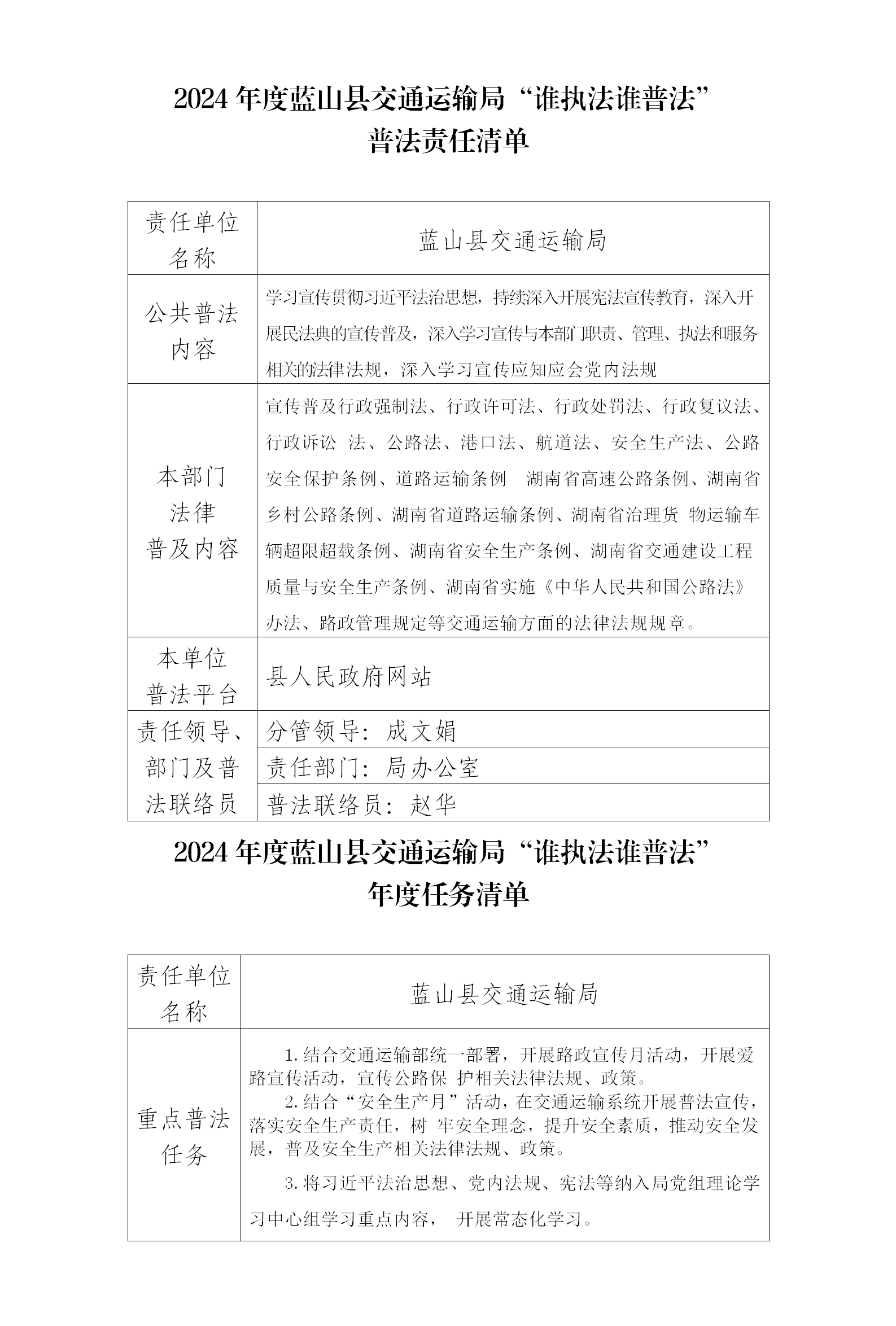 名称: 蓝山县交通运输局“谁执法谁普法”责任单位普法责任清单、任务清单