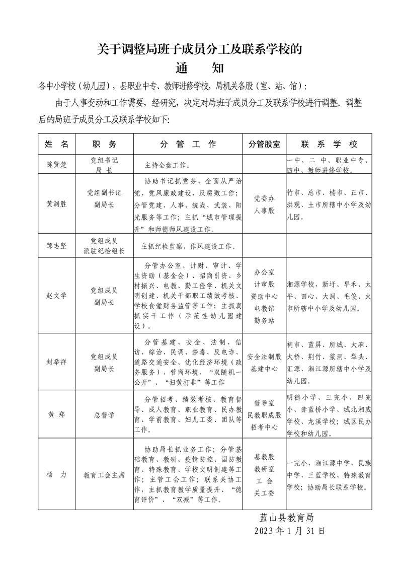名称: 关于调整局班子成员分工及联系学校的通 知