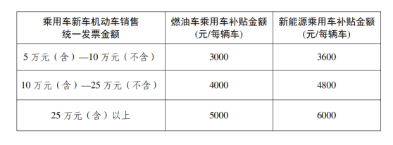 对报废国三及以下排放标准乘用车或2018年4月30日(含当日)前注册登记的新能源乘用车并购买纳入工业和信息化部《减免车辆购置税的新能源汽车车型目录》的新能源乘用车新车的,补贴1万元;报废国三及以下排放标准燃油乘用车并购买2.0升及以下排量燃油乘用车新车的,补贴7000元。