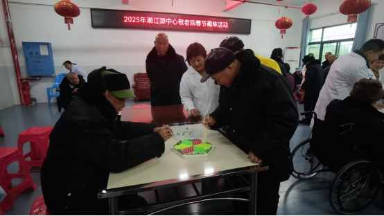 金蛇献瑞迎春来,福禄寿喜齐聚堂。为弘扬中华民族敬老、爱老、助老的优良传统美德,进一步倡导敬老、爱老、助老的新风尚,逐步增强全社会关爱老人的责任意识,1月27日,在新春佳节到来之际,蓝山县民政局联合蓝山中西医结合医院工作人员到湘江源中心敬老院开展“迎新春,庆佳节”慰问活动,工作人员们和供养人员欢聚一堂,共同庆祝良辰佳节!在活动室内,工作人员提前准备好场地,还购买了节日礼品及小零食,尽可能地让所有供养人员参与其中,享受节日的乐趣此次活动在欢声笑语中拉开序幕,其中最具特色的当数夹弹珠和套圈圈两个趣味环节。老人们围坐在一起,脸上洋溢着笑容,他们用筷子夹起弹珠,小心翼翼地放入指定容器,每一成功夹起都伴随着大家的喝彩声。套圈圈的环节更是妙趣横生,老人们手拿套圈,面对不同的物品(如礼品、食物等),投出圈圈,每套中一次都伴随着一阵欢呼。除了这两个游戏环节,敬老院还为老人们准备了茶话会。大家围坐在一起,品茶聊天,分享着各自的生活经验和故事。在轻松愉快的氛围中,老人们畅所欲言,表达着对生活的热爱和对未来的期待。