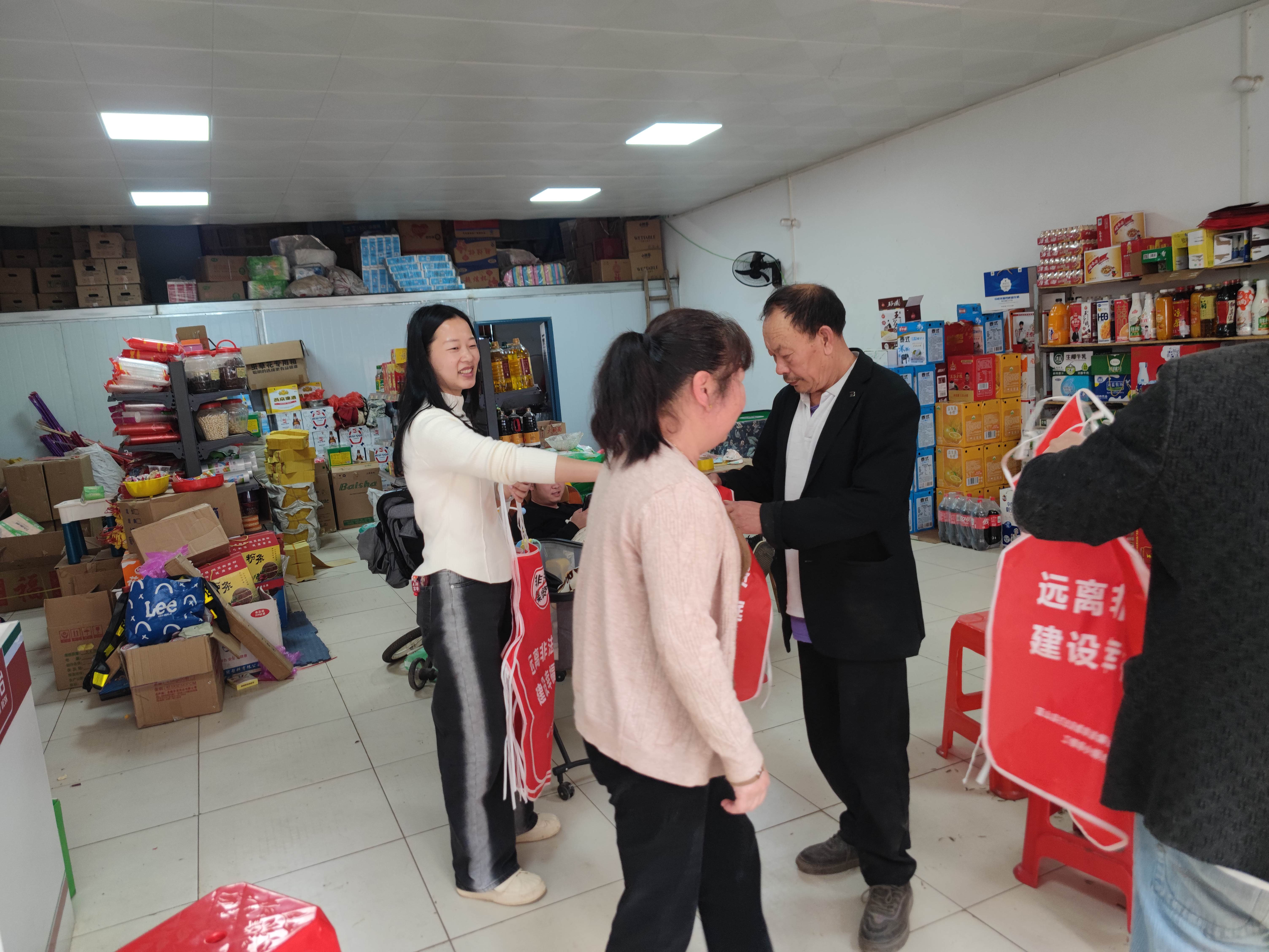 “周老板,我们今天来给你发两个围裙,也发一些非法集资的资料给你看看。你自己是当老板的,一定要擦亮眼睛,不要相信一夜变富的鬼话,小心成为‘一夜变负’,负数得负。”楠市镇工作人员对开超市的周老板宣传道。