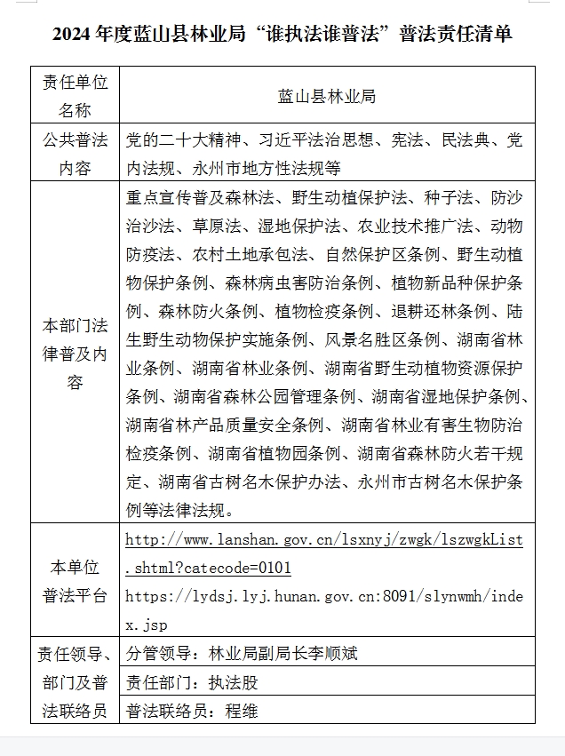 名称: 2024年度蓝山县林业局“谁执法谁普法”普法责任清单