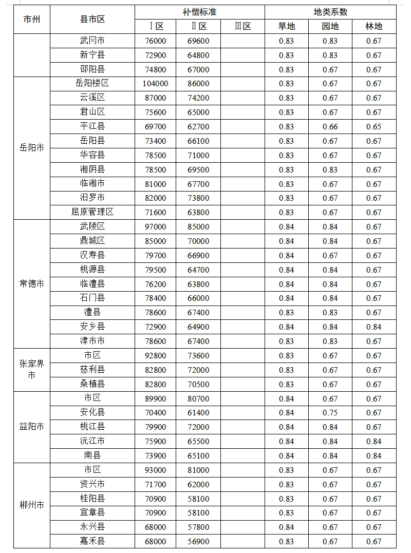 四、市州人民政府可以根据当地实际制定具体实施细则,作出相应调整,但是不得低于本通知确定的补偿标准和地类系数。