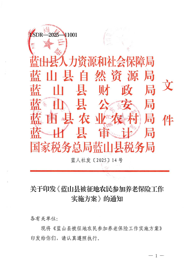 关于印发《蓝山县被征地农民参加养老保险工作实施方案》的通知