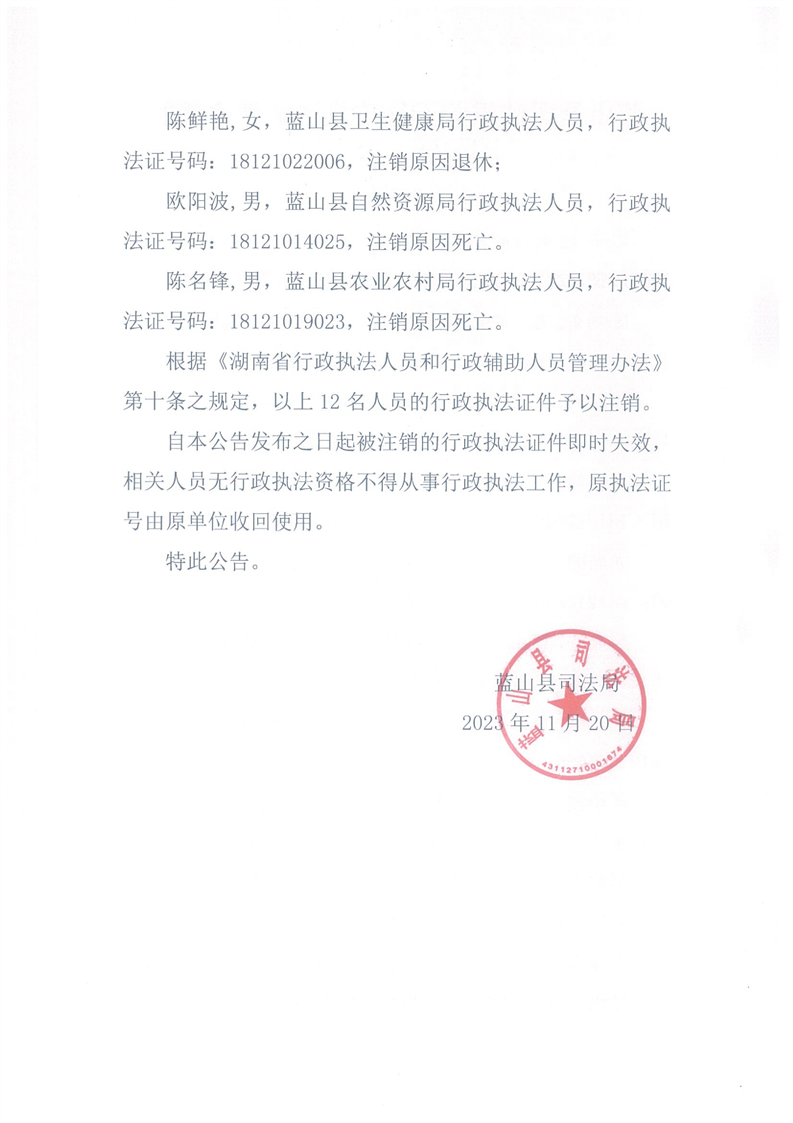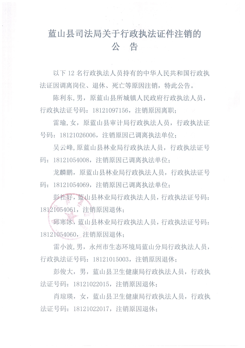 名称: 蓝山县司法局关于行政执法证件注销的公告