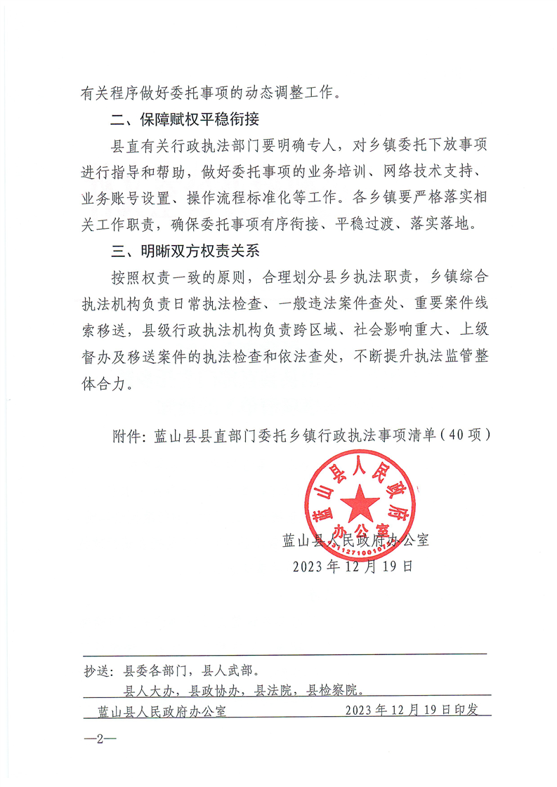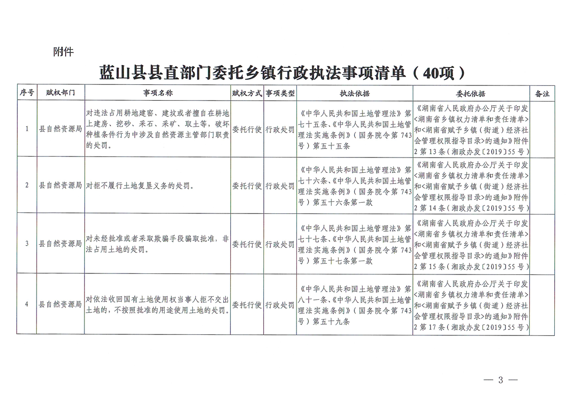 蓝山县人民政府办公室关于印发《蓝山县县直部门委托乡镇行政执法事项清单》的通知
