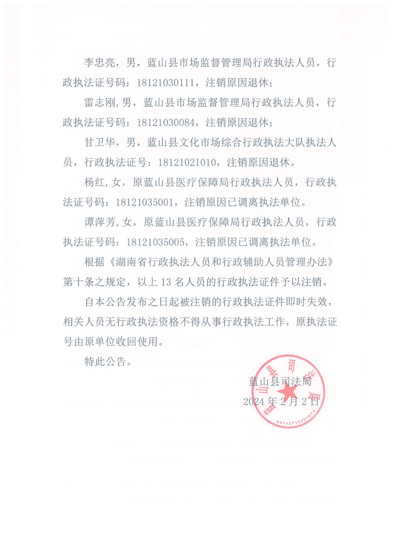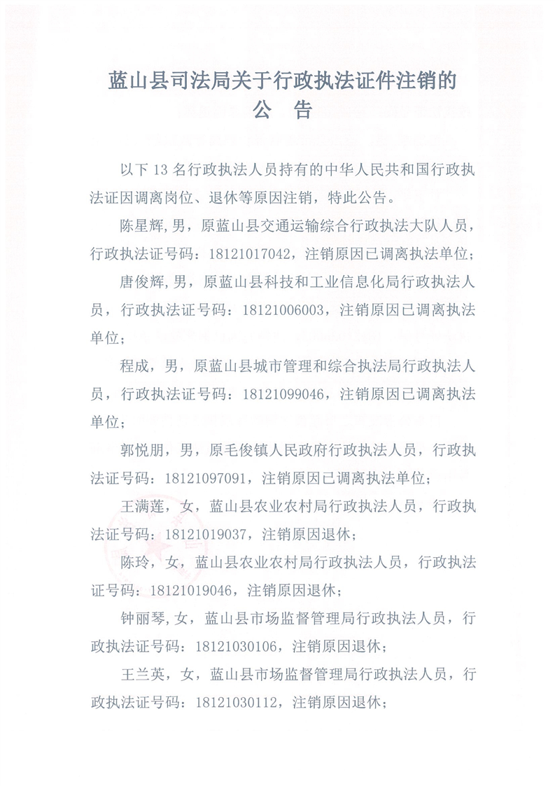 名称: 蓝山县司法局关于行政执法证件注销的公告