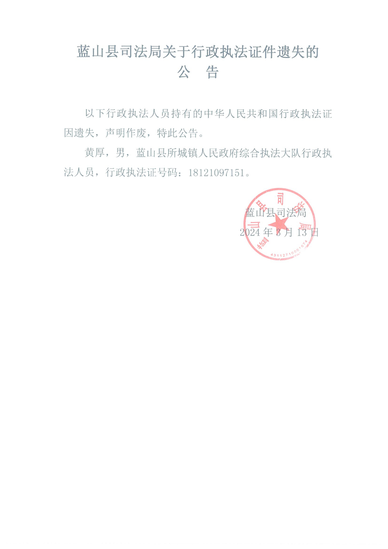 名称: 蓝山县司法局关于行政执法证件遗失的公告