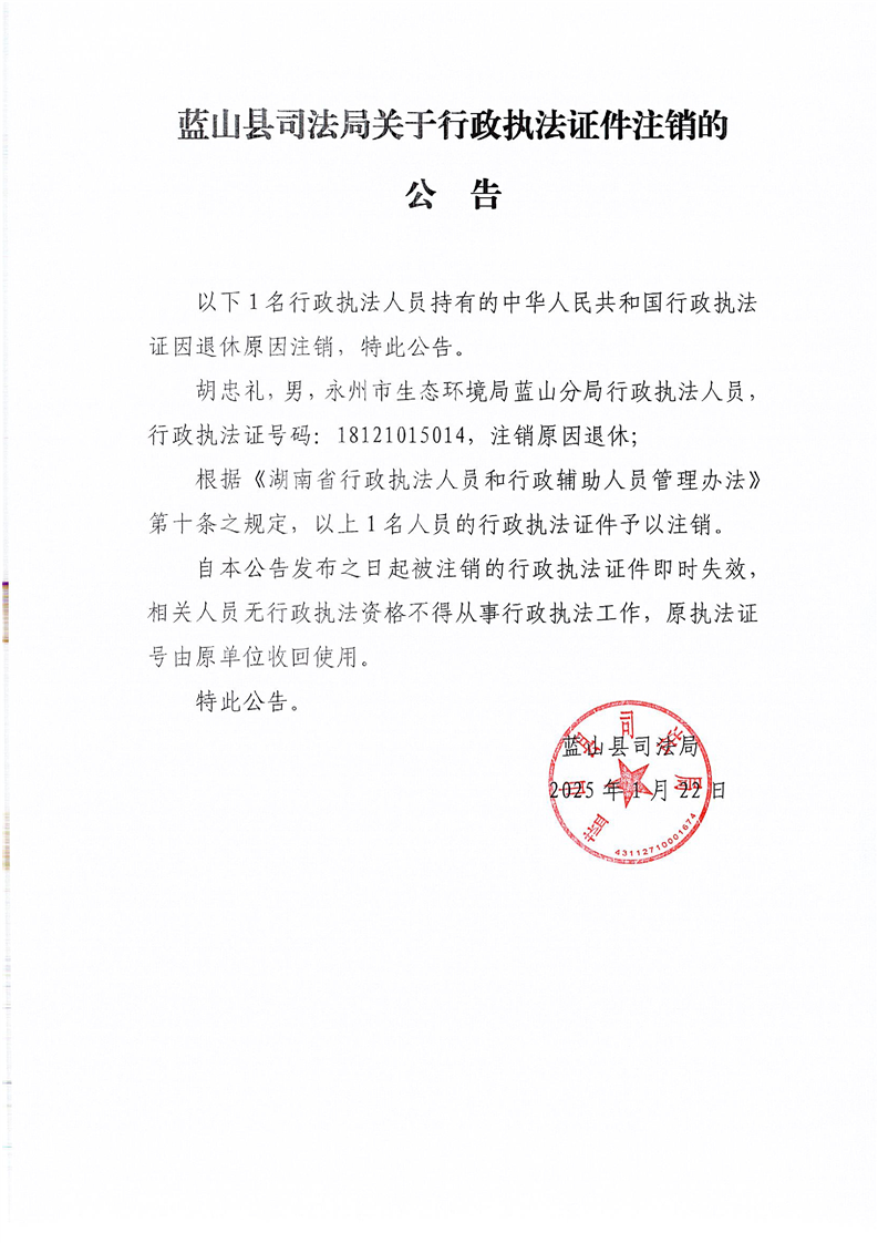 名称: 蓝山县司法局关于行政执法证件注销的公告