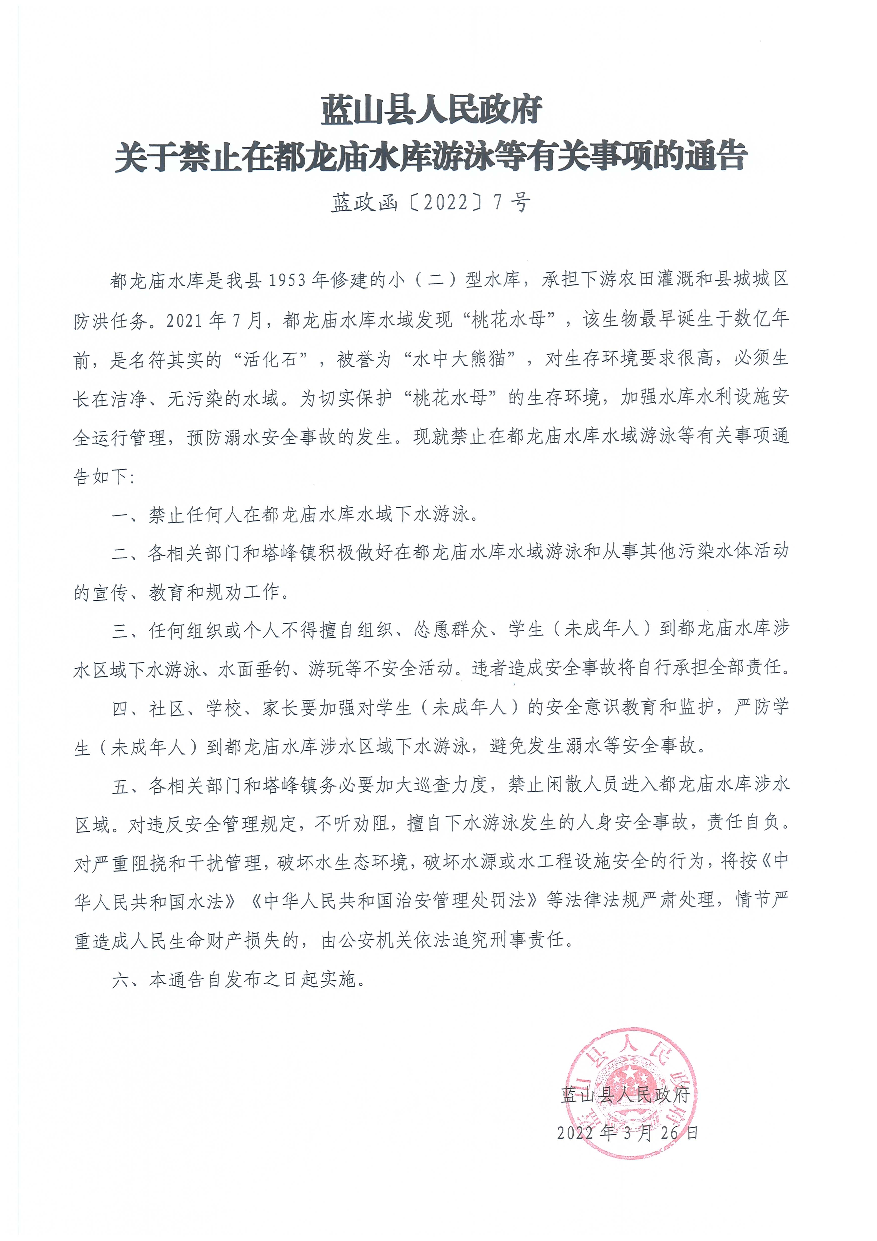 名称: 蓝山县人民政府关于禁止在都龙庙水库游泳等有关事项的通告