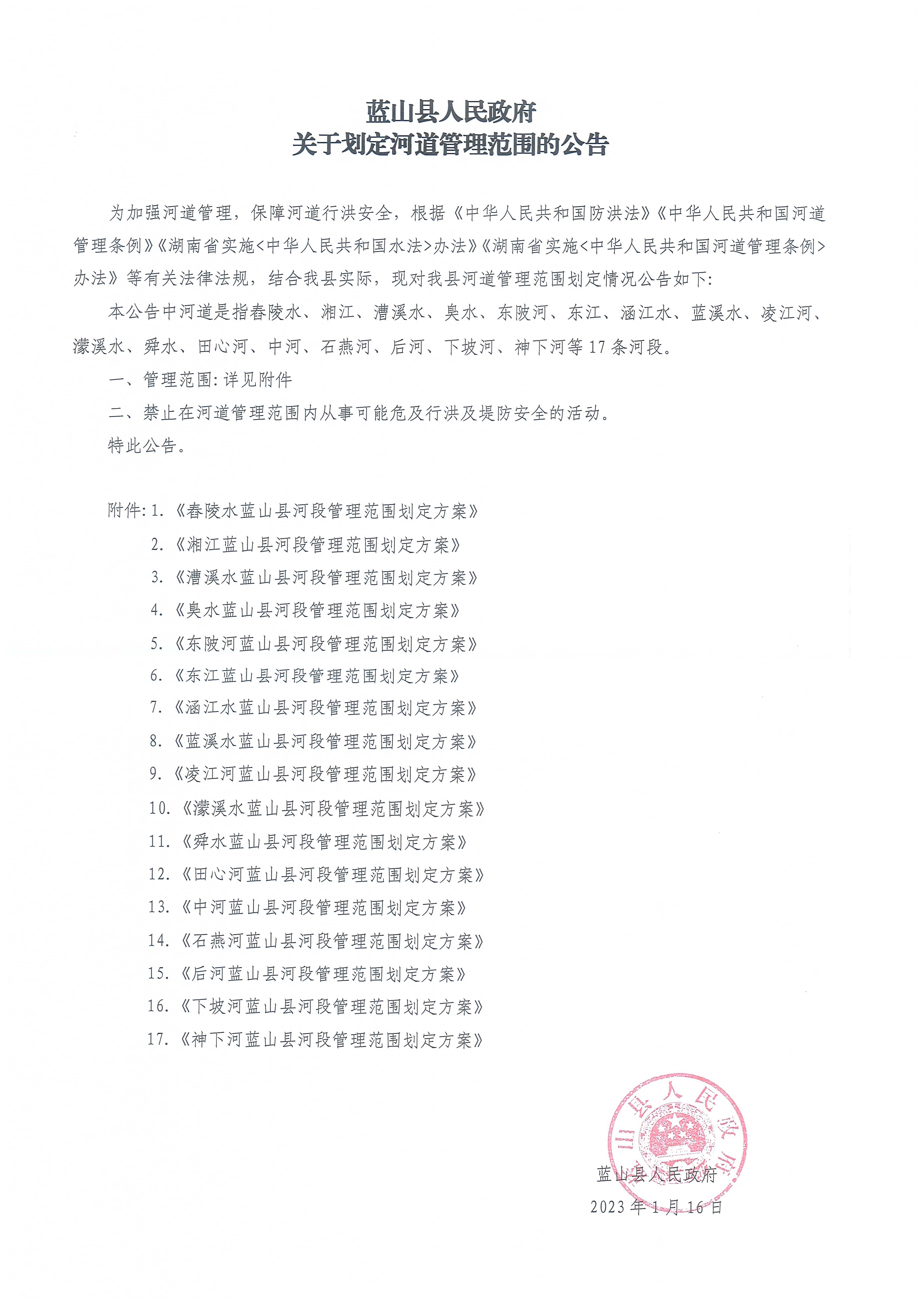 名称: 蓝山县人民政府关于划定河道管理范围的公告