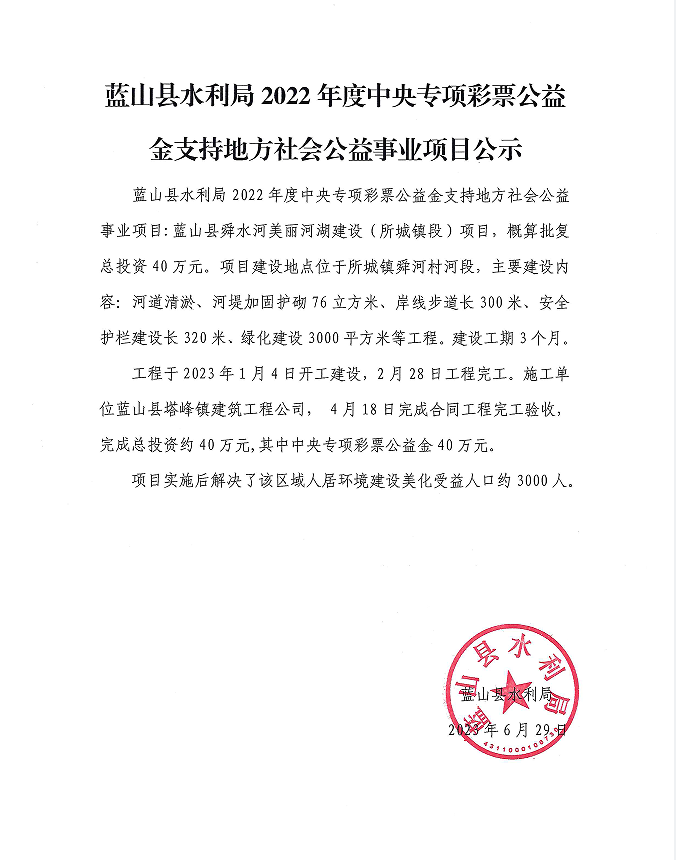 名称: 蓝山县水利局2022年度中央专项彩票公益金支持地方社会公益事业项目公示--蓝山县舜水河美丽河湖建设项目