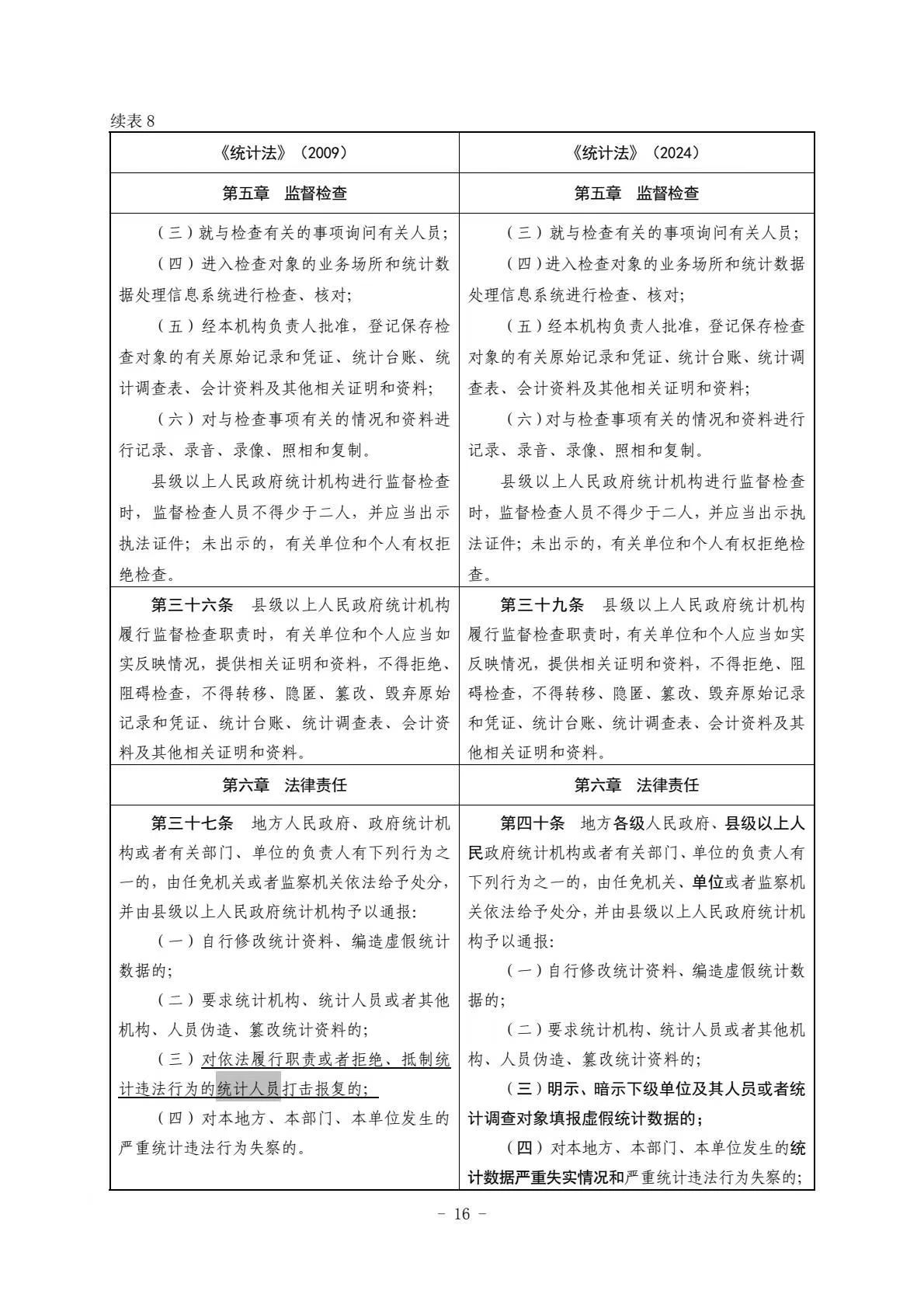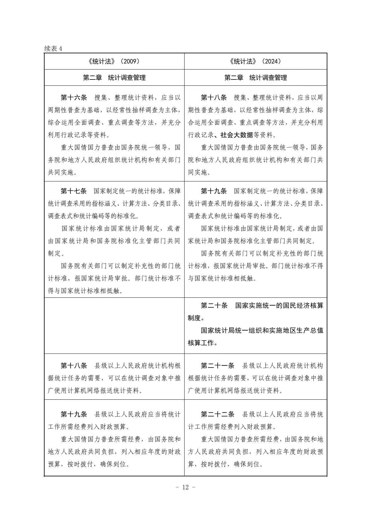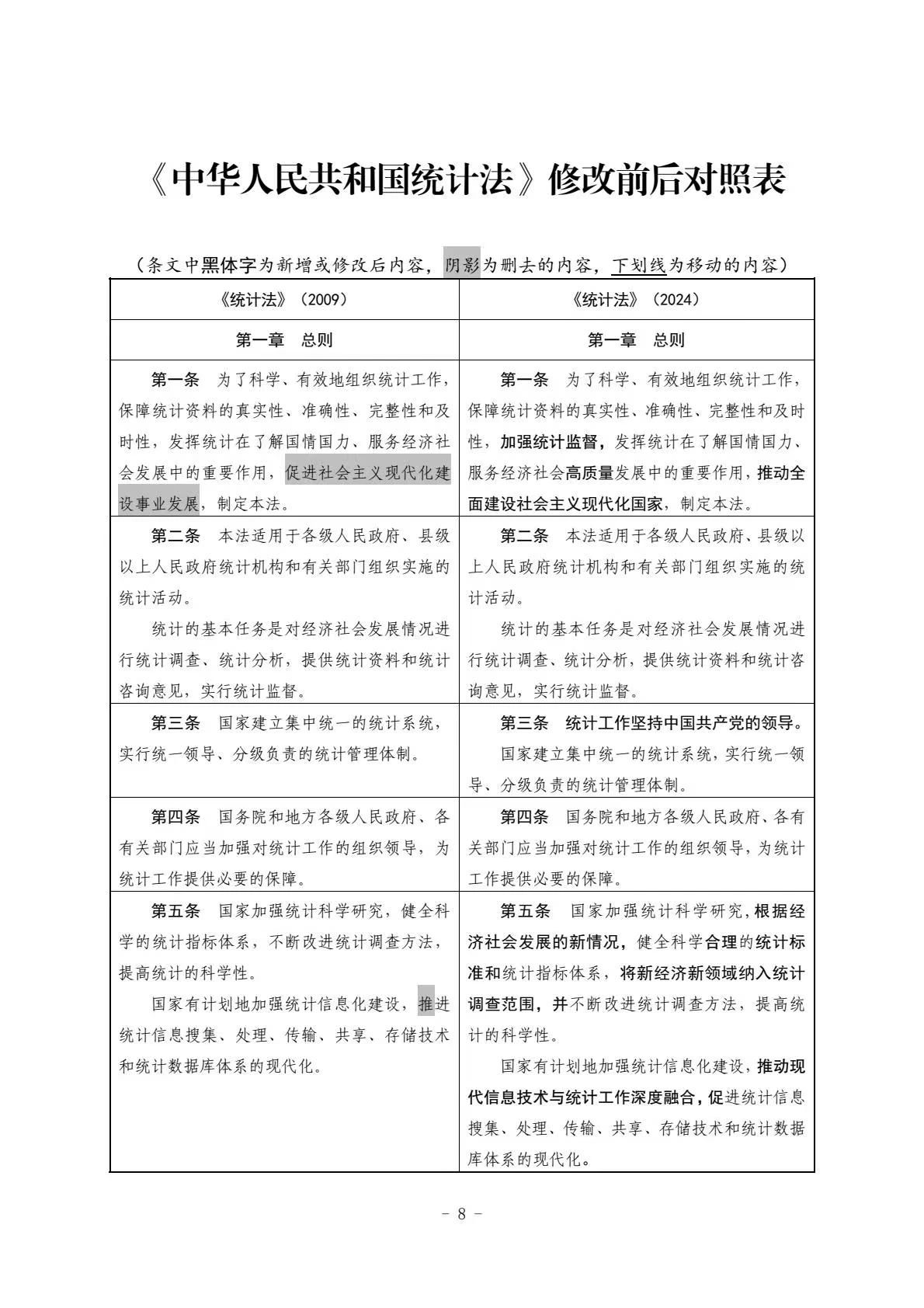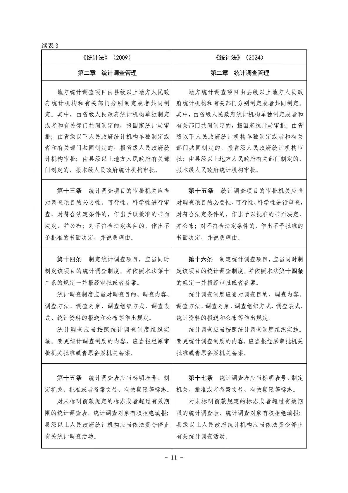 2024年9月13日,十四届全国人大常委会第十一次会议表决通过了《全国人民代表大会常务委员会关于修改〈中华人民共和国统计法〉的决定》,自公布之日起施行。 在保持现行统计法制度框架基本不变的基础上,此次统计法修改围绕强化防范和惩治统计造假责任、加强统计监督、提高统计科学性等方面,新增加3条、修改21条。 此次统计法修改坚持问题导向,对统计监督等统计基本职能予以充实,对统计调查、国民经济核算、统计资料管理和公布等统计基本制度予以补充完善,对统计造假等违法行为的法律责任予以强化,补齐法律制度短板弱项,将为从根本上解决一些长期困扰统计工作的深层次矛盾和问题、推动统计工作高质量发展提供坚实法治保障。