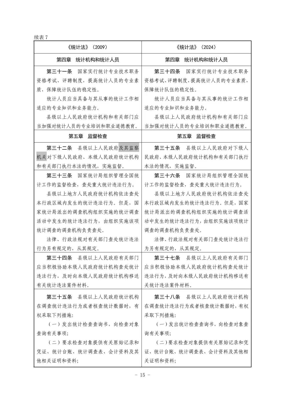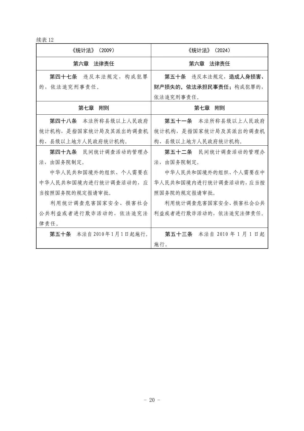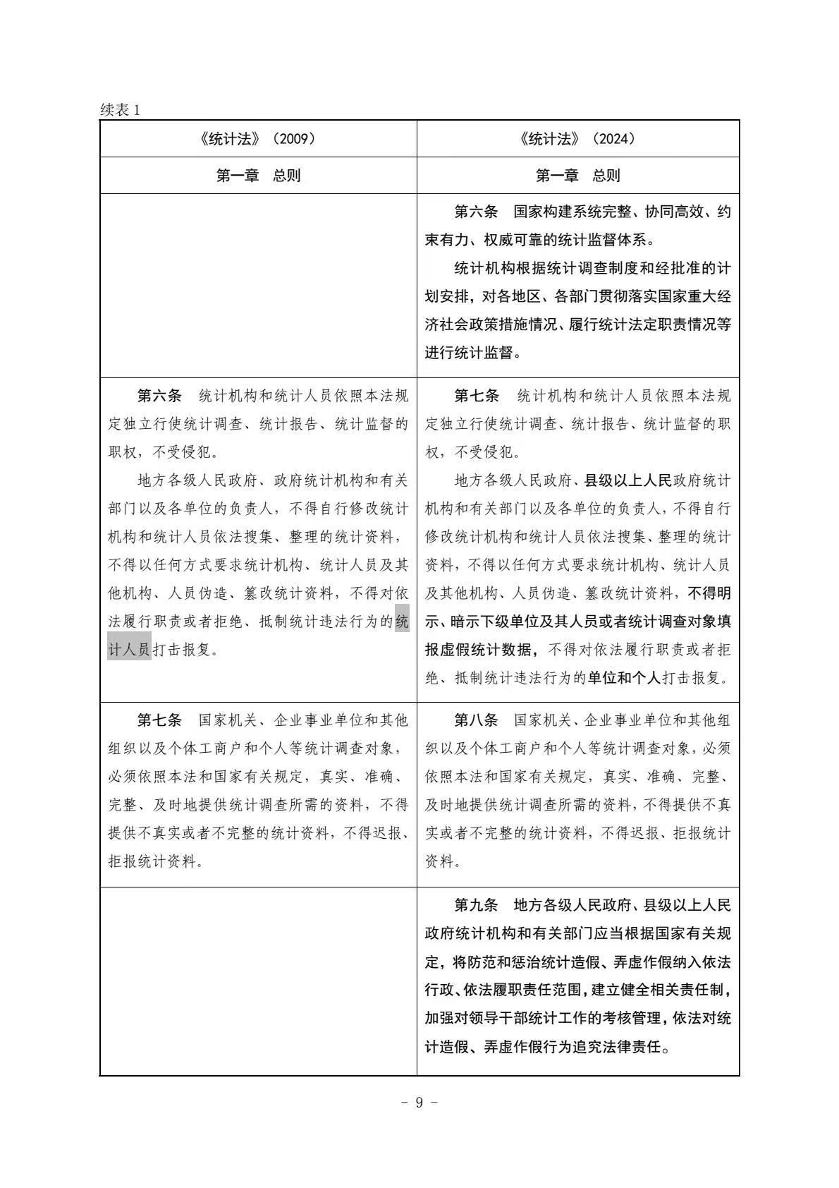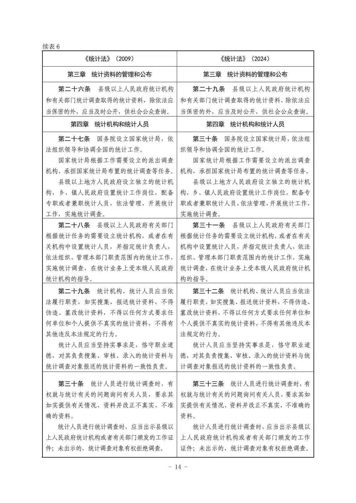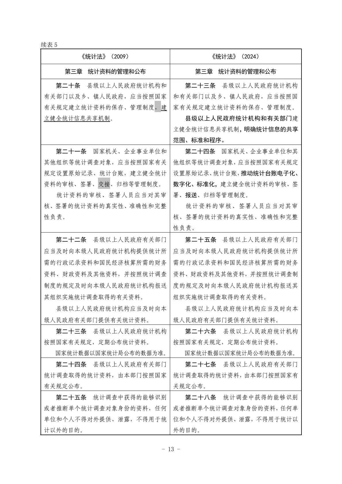 2024年9月13日,十四届全国人大常委会第十一次会议表决通过了《全国人民代表大会常务委员会关于修改〈中华人民共和国统计法〉的决定》,自公布之日起施行。 在保持现行统计法制度框架基本不变的基础上,此次统计法修改围绕强化防范和惩治统计造假责任、加强统计监督、提高统计科学性等方面,新增加3条、修改21条。 此次统计法修改坚持问题导向,对统计监督等统计基本职能予以充实,对统计调查、国民经济核算、统计资料管理和公布等统计基本制度予以补充完善,对统计造假等违法行为的法律责任予以强化,补齐法律制度短板弱项,将为从根本上解决一些长期困扰统计工作的深层次矛盾和问题、推动统计工作高质量发展提供坚实法治保障。