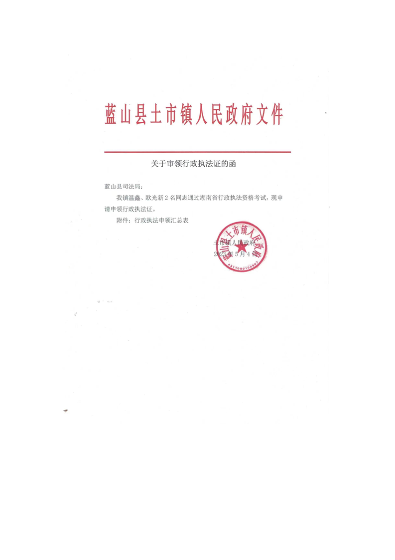 名称: 蓝山县土市镇申领行政执法证相关信息公示