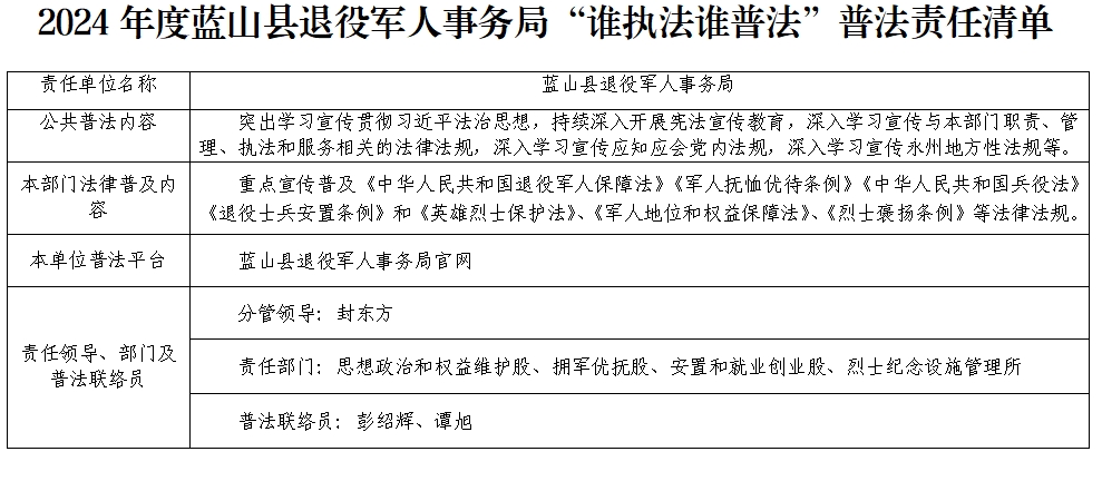 名称: 2024年度蓝山县退役军人事务局“谁执法谁普法”普法责任清单
