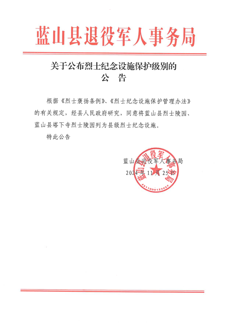 发文机关: 蓝山县退役军人事务局 发文日期: 2024-11-25