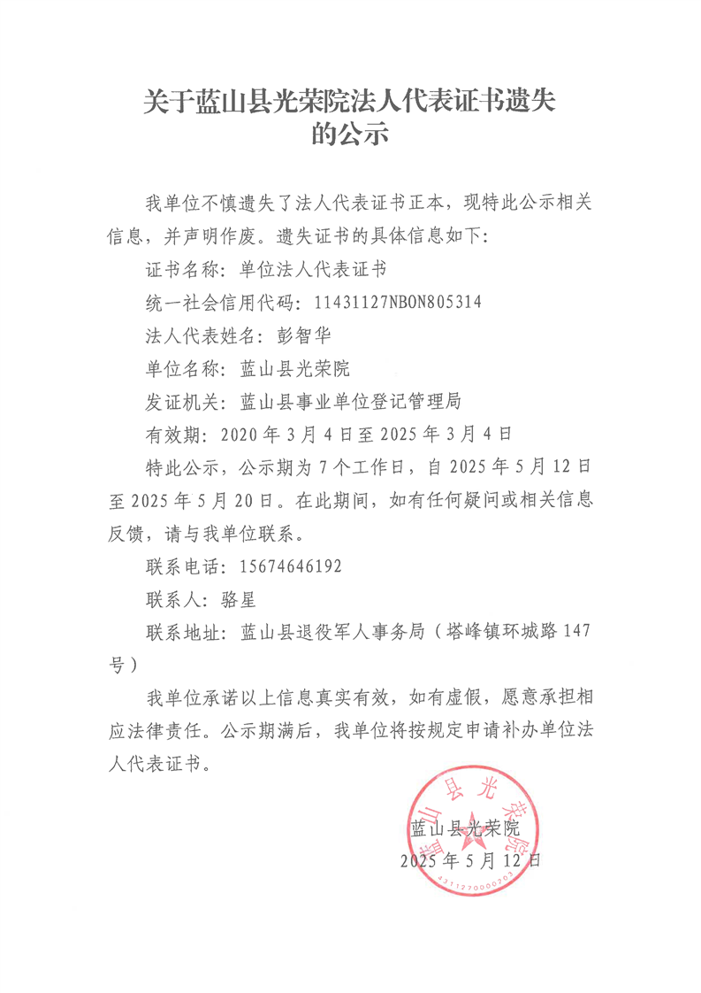 名称: 关于蓝山县光荣院法人代表证书遗失的公示