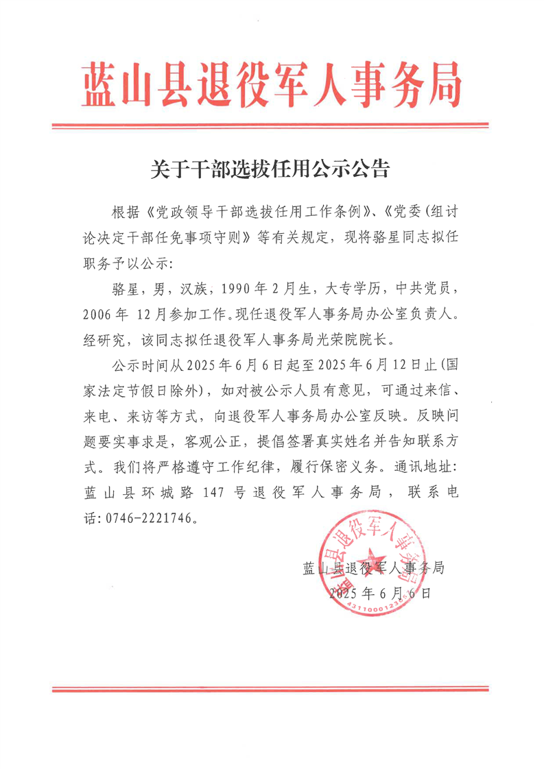发文机关: 蓝山县退役军人事务局 发文日期: 2025-06-06