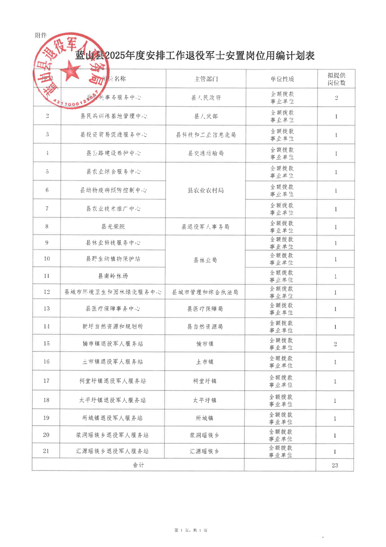 名称: 蓝山县2025年度退役军士安置岗位用编计划表