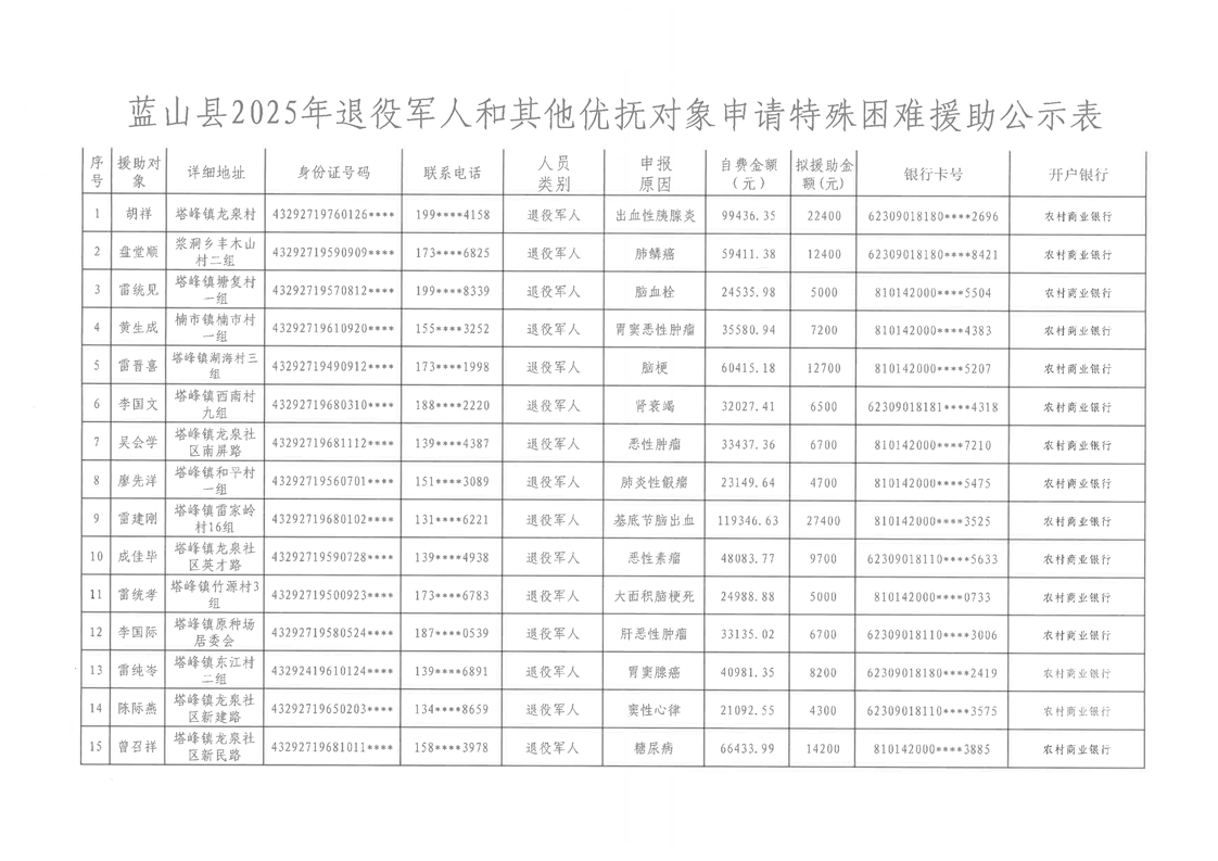名称: 蓝山县2025年度退役军人和其他优抚对象申请特殊困难援助基本情况表(最终表) - 公示(1)