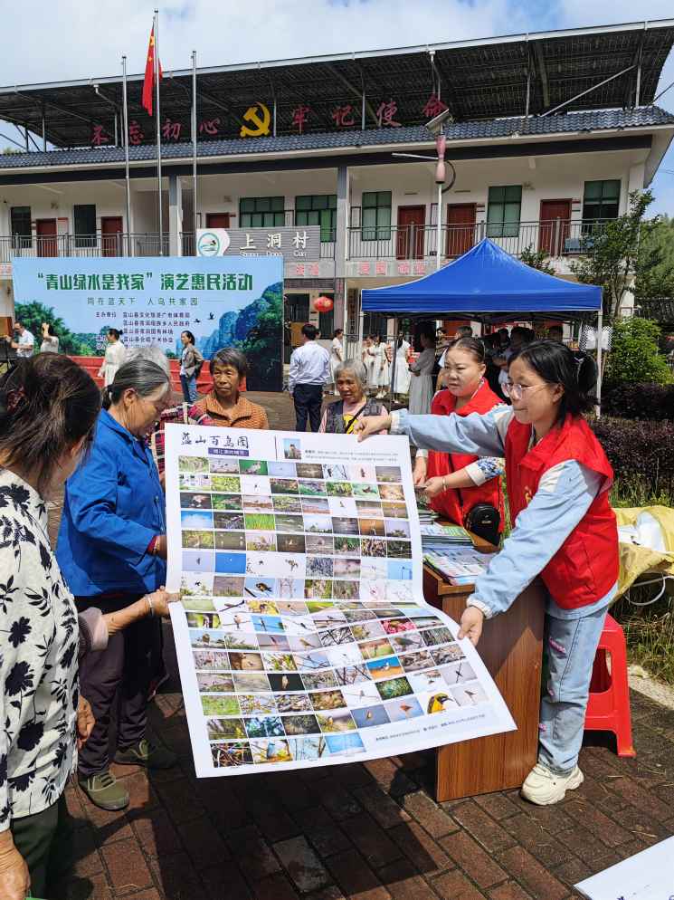 除主舞台演出外,现场还设置了志愿服务点,向群众发放护林防火宣传资料100余份,同时宣传爱鸟护鸟达人精心拍摄的《蓝山百鸟图》照片。《蓝山百鸟图》生动呈现了蓝山县生物多样性保护成果,吸引众多群众驻足观看。活动尾声,全体演员与观众齐唱《我的祖国》,将现场气氛推向高潮。