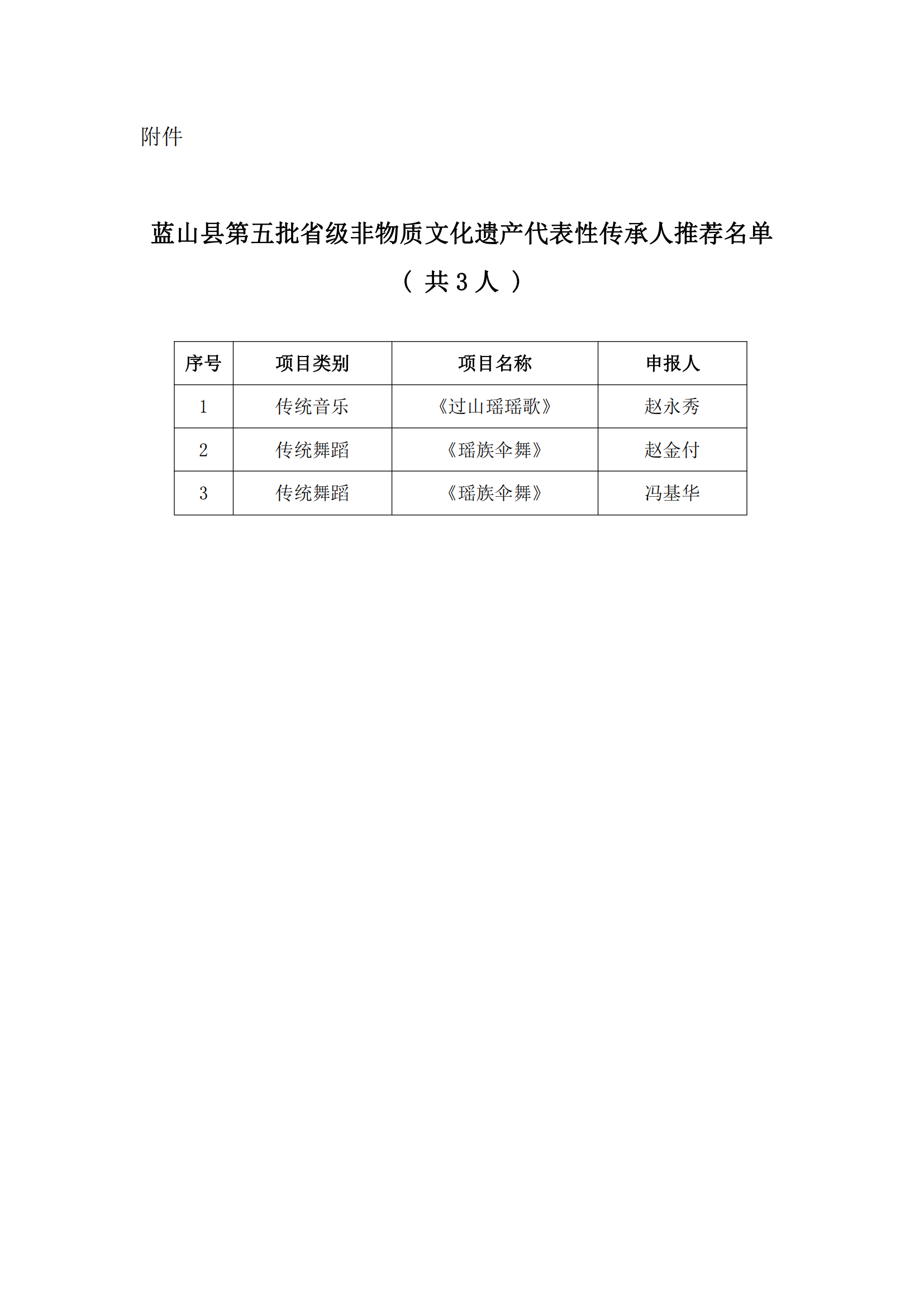 为加强非物质文化遗产传承人队伍建设,有效保护和传承非物质文化遗产,根据《湖南省非物质文化遗产项目代表性传承人认定与管理办法》、《湖南省文化和旅游厅关于组织申报第五批省级非物质文化遗产代表性传承人的通知》和永州市文化旅游广电体育局《关于组织申报第五批省级非物质文化遗产代表性传承人的通知》。蓝山县文化旅游广电体育局组织开展省级非遗项目代表性传承人申报推荐工作,经资格审查、专家评审等程序,提出第五批省级非物质文化遗产代表性传承人推荐名单(共3名,见附件),现将第五批省级非物质文化遗产代表性传承人推荐名单向社会公示,公示期2023年4月26日-5月12日。在公示期间内若有异议相关人员可通过来函、来电等方式,向蓝山县文化旅游广电体育局反映,申诉材料须以书面形式呈递,逾期一律不受理。