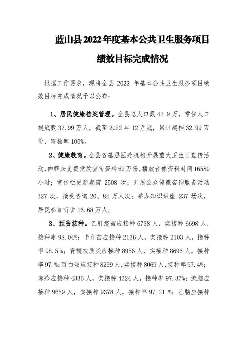蓝山县2022年度基本公共卫生服务项目绩效目标完成情况