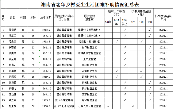 为切实解决我县老年乡村医生的生活困难问题,按照《湖南省人民政府办公厅关于做好老年乡村医生生活困难补助发放工作的通知》(湘政办发〔2014〕102号)和《蓝山县人民政府关于全县老年乡村医生生活困难补助发放工作的通告》(蓝政函〔2014〕63号)精神,根据相关部门联合审核情况,现就我县2024年新增老年乡村医生生活困难补助发放名单进行公示。公示期为2024年9月3日至9月9日,如对审核结果有异议请在公示期内以书面(实名)形式反馈到蓝山县卫生健康局基层卫生股或致电0746-2213234。