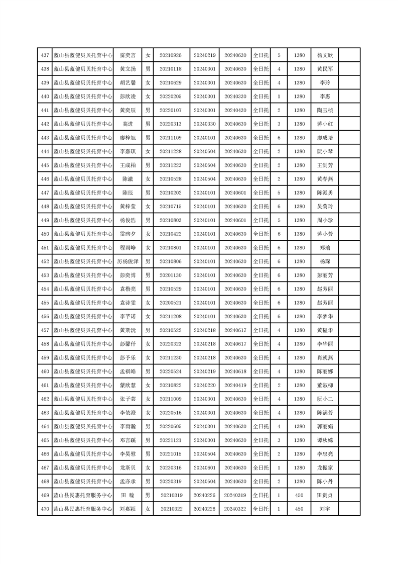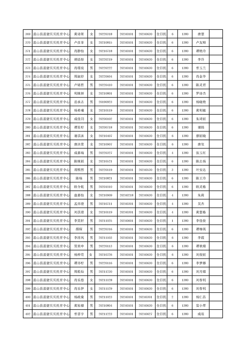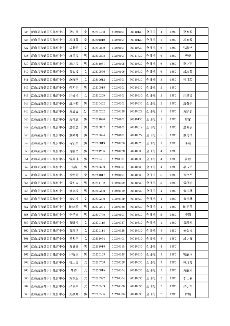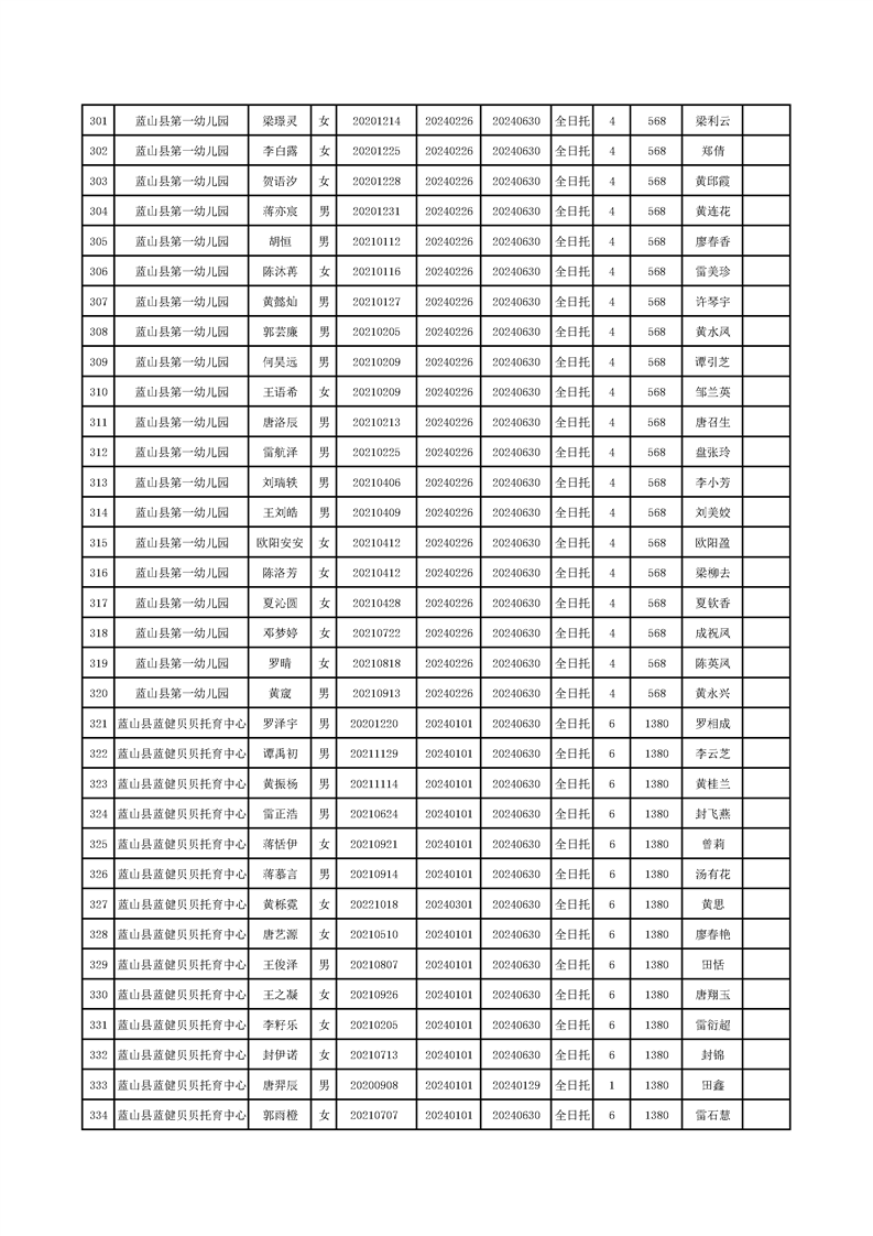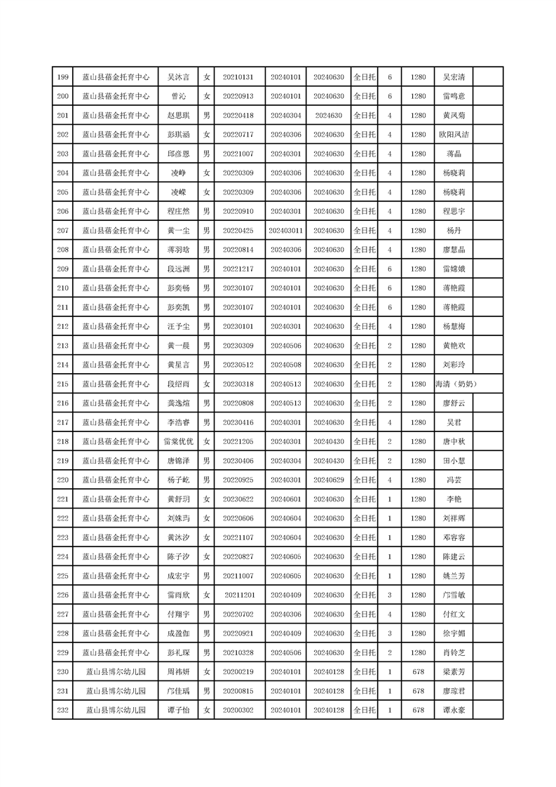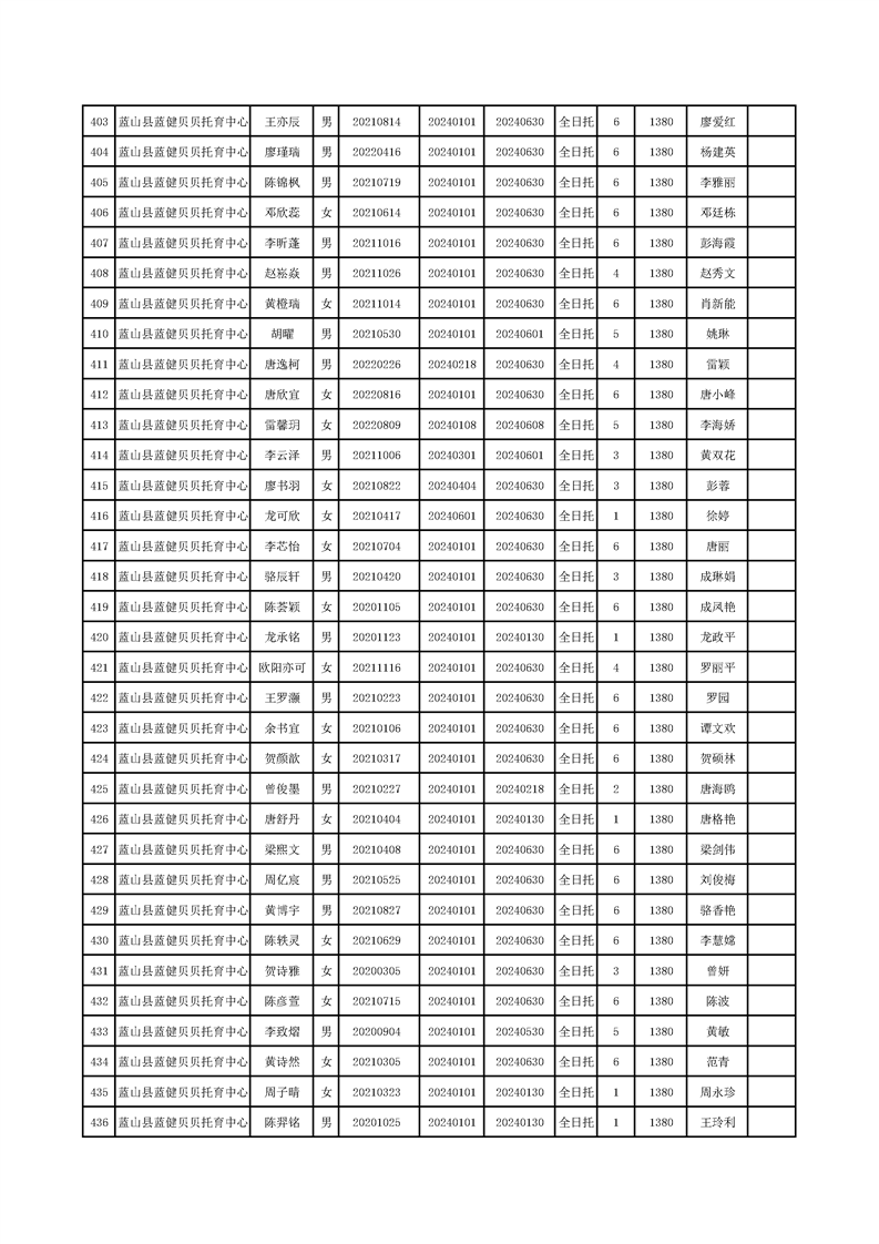 蓝山县2024年1-6月份普惠性托位在托婴幼儿花名册