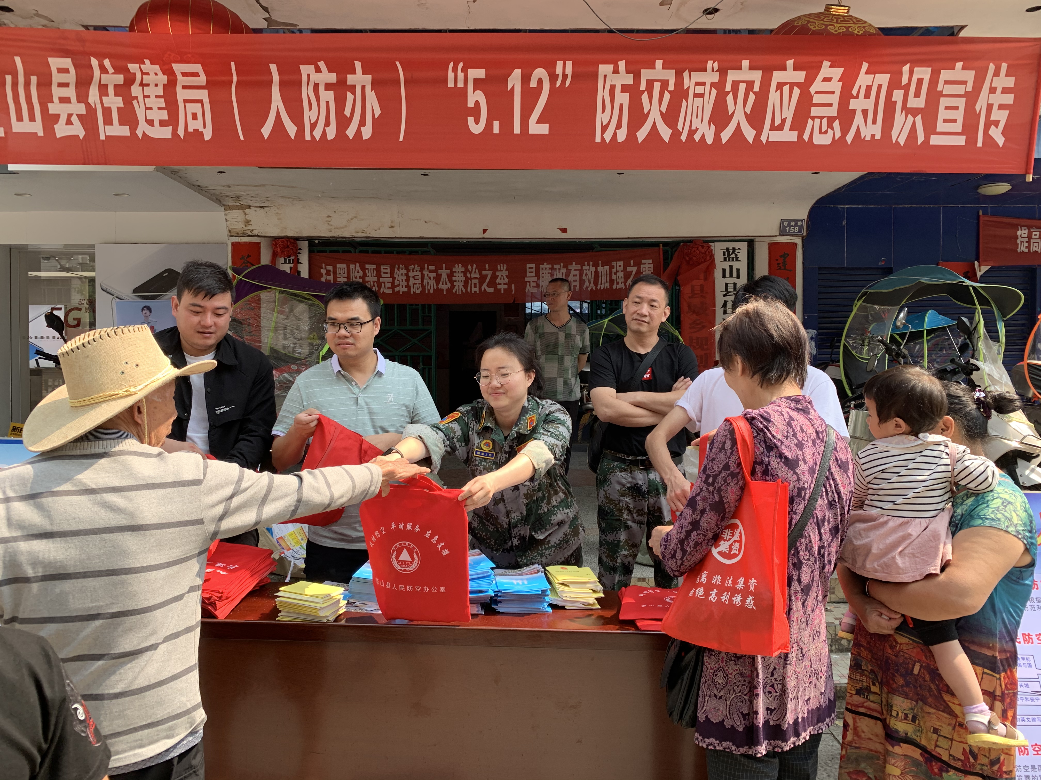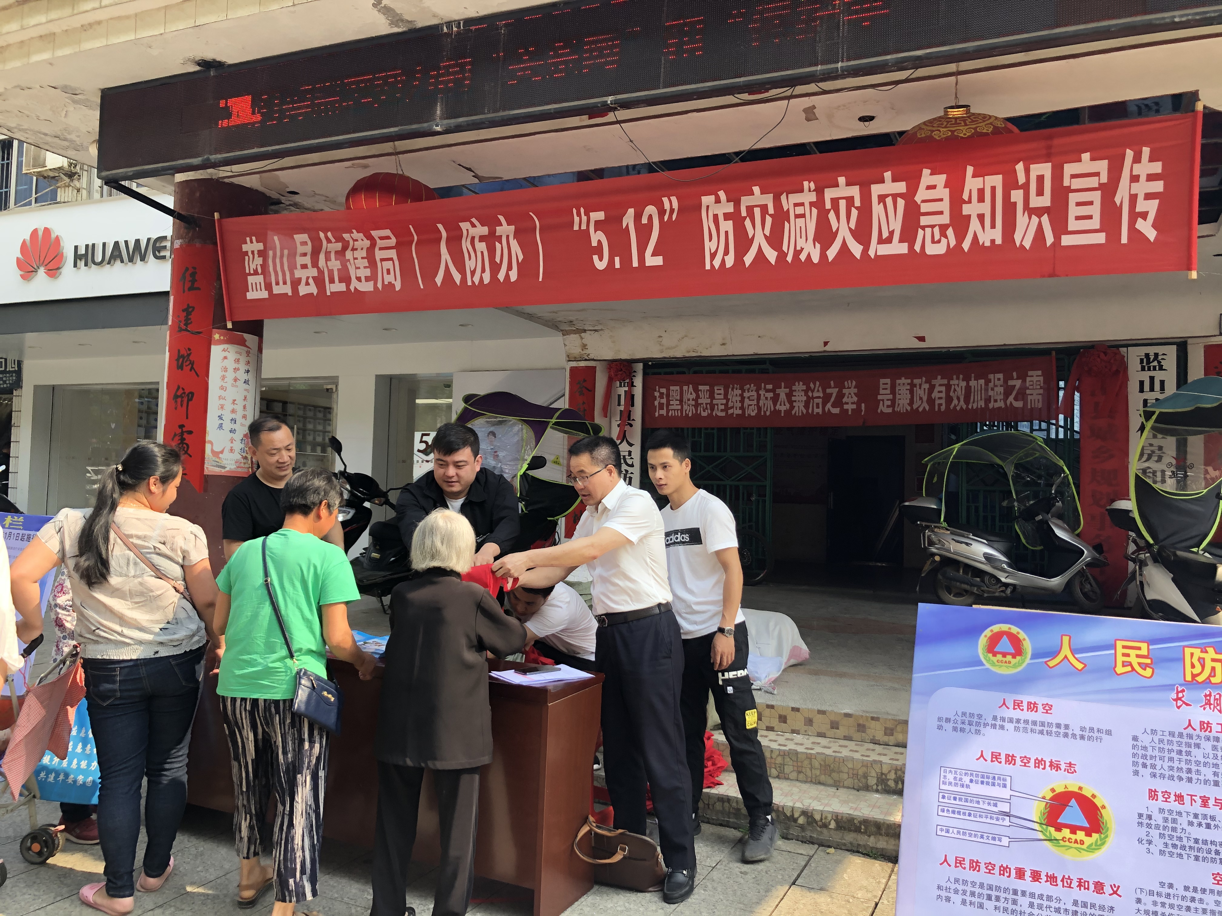 今年5月12日是全国第十二个防灾减灾日,为进一步增强全社会公共安全意识,普及公众防灾减灾救灾避险知识,提高应对突发事件的能力。当天,蓝山县住建局(人防办)在机关办公楼前坪举行主题为“提升基层应急能力,筑牢防灾减灾救灾的人民防线”防灾减灾日宣传活动。县委常委、常务副县长何江鸿出席此次宣传活动。