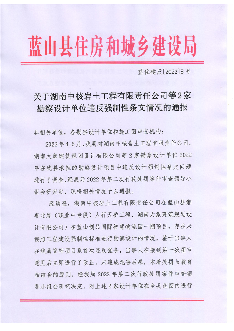 名称: 关于湖南中核岩土工程有限责任公司等2家设计单位违反强制性条文情况的通报