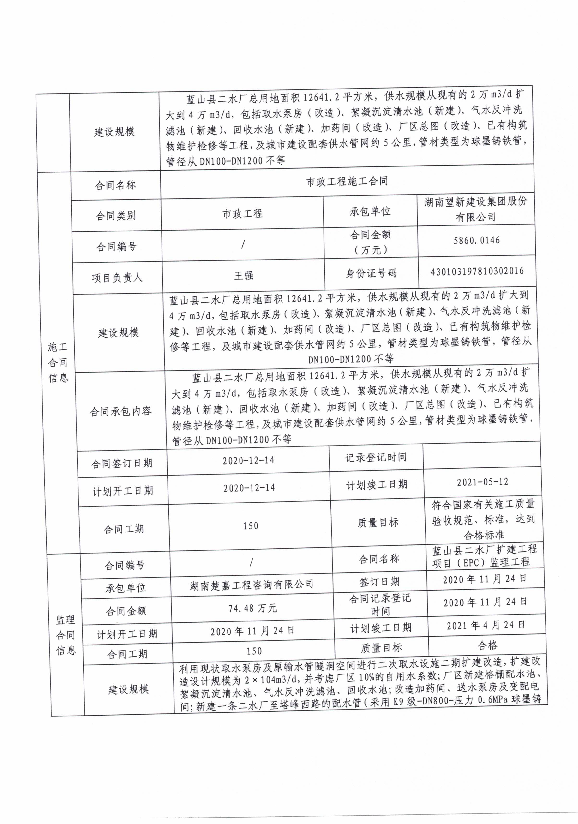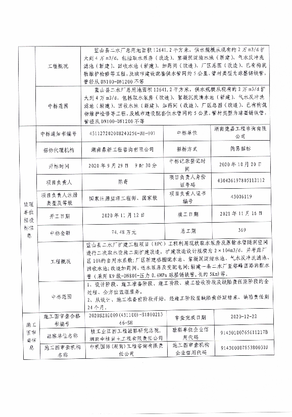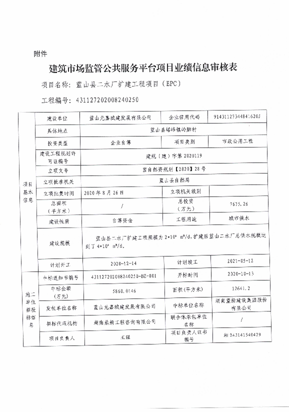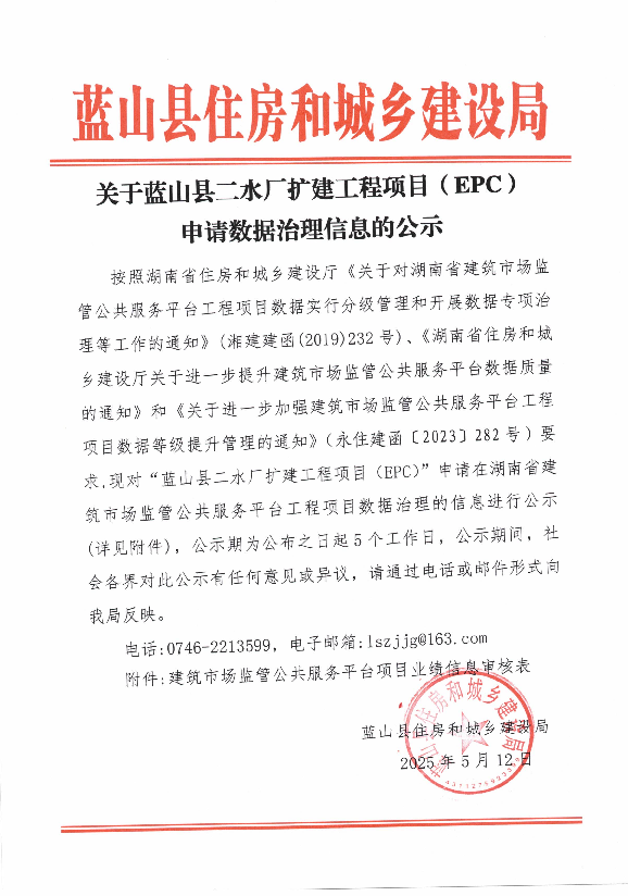 关于蓝山县二水厂扩建工程项目(EPC)申请数据治理信息的公示
