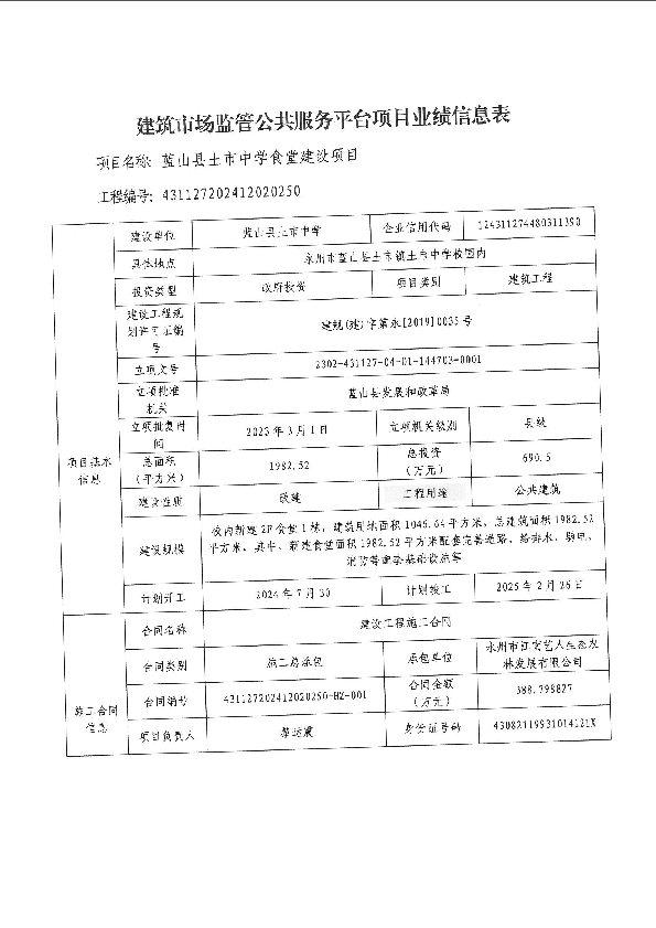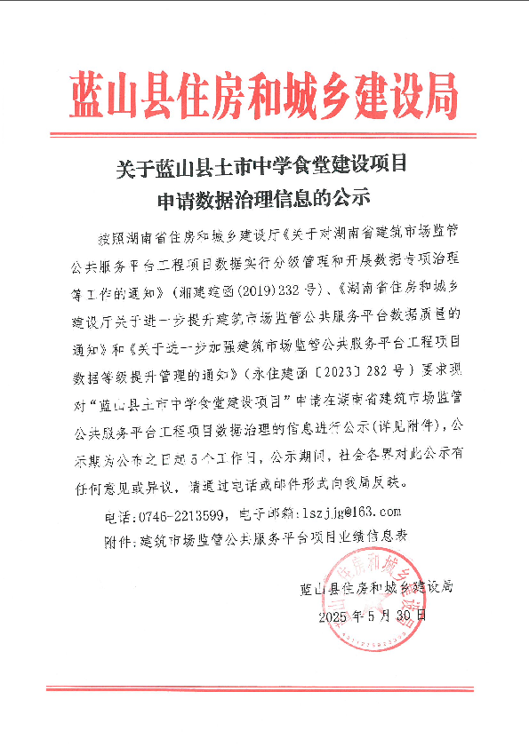 名称: 关于蓝山县土市中学食堂建设项目申请数据治理信息的公示