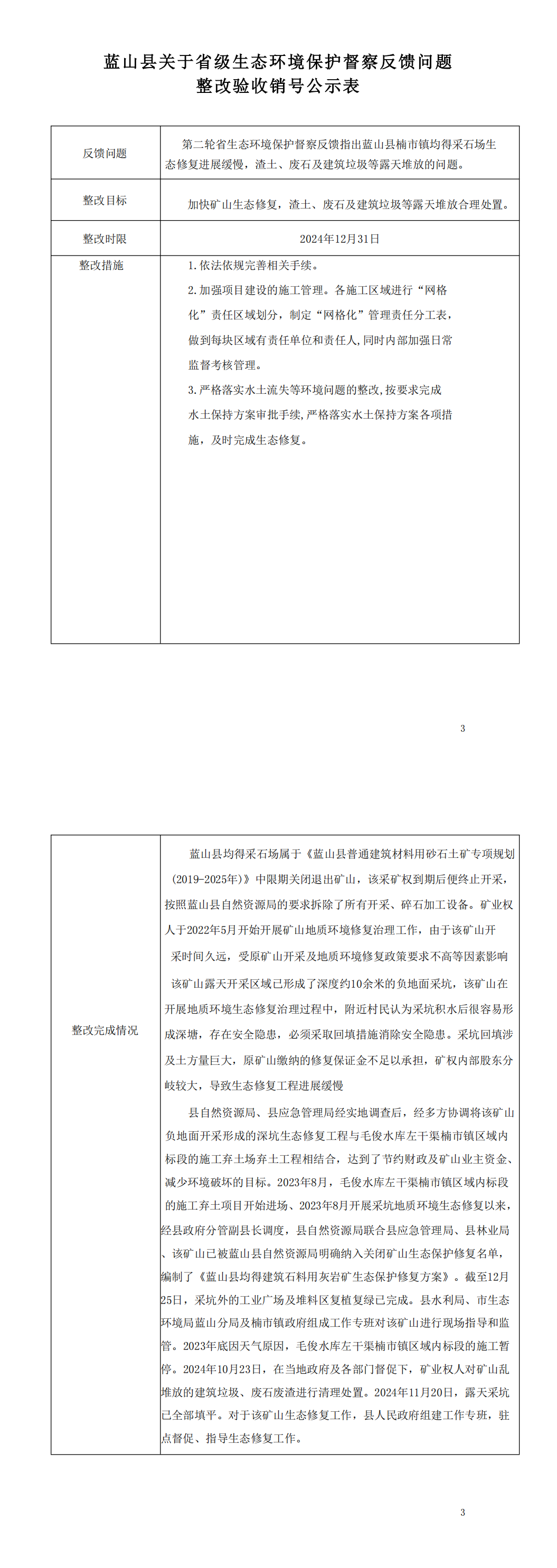 名称: 蓝山县关于省级生态环境保护督察反馈问题整改验收销号公示表