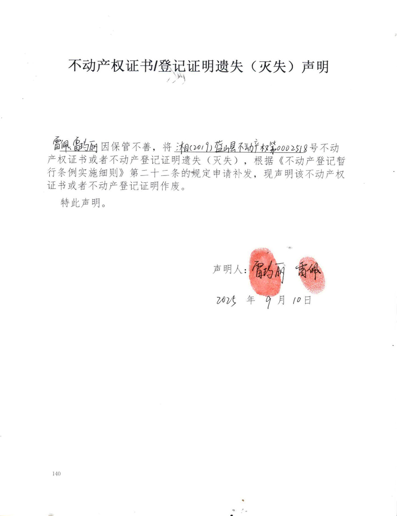 名称: 雷佩、雷玛丽不动产权证书/登记证明遗失(灭失)声明
